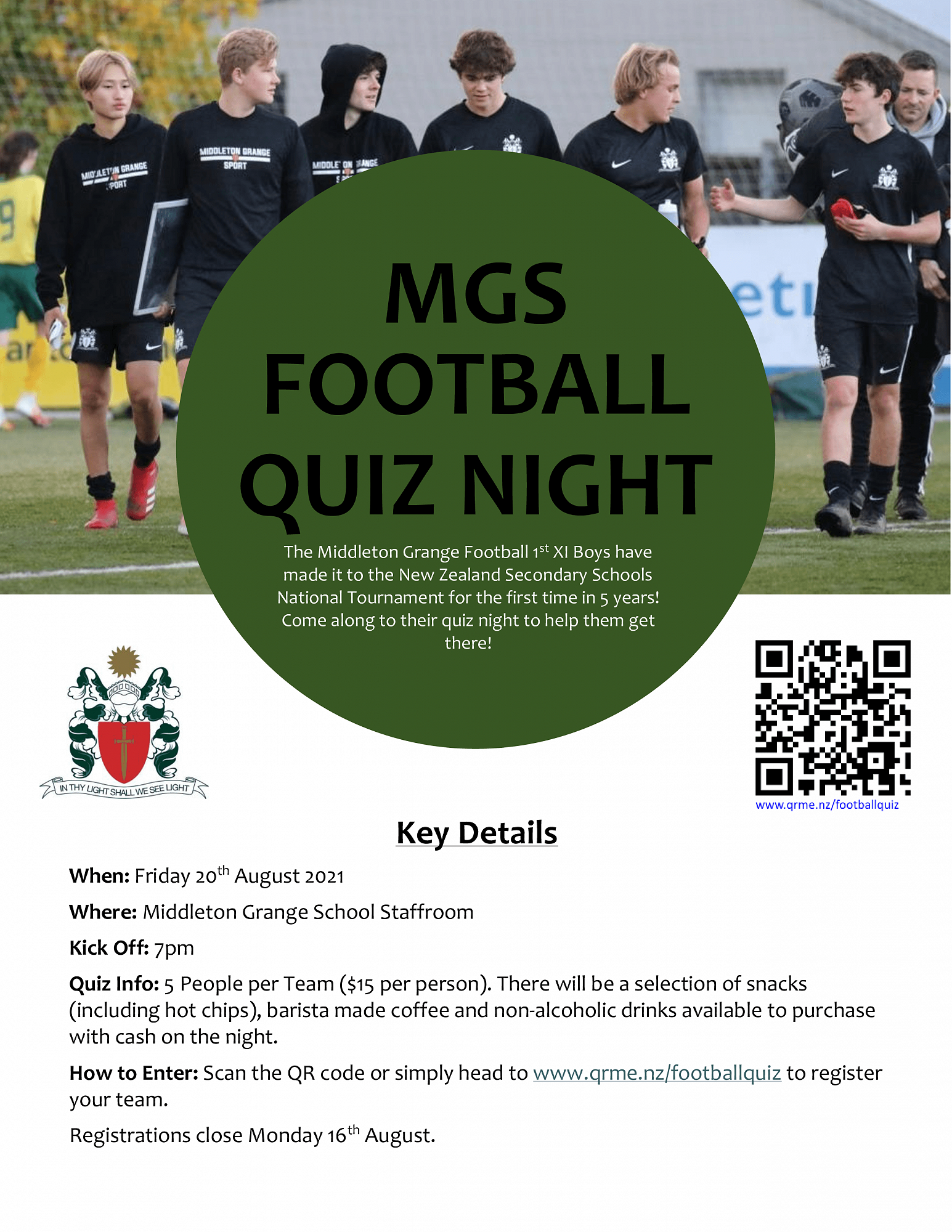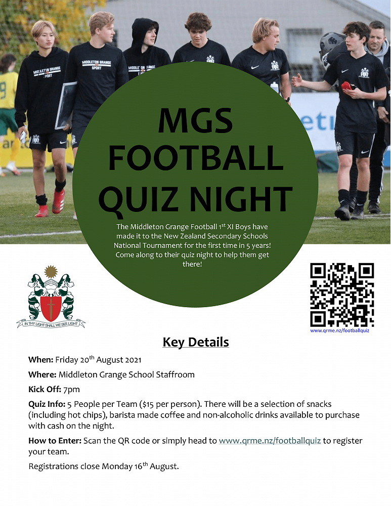 The Middleton Grange Football Boys 1st XI have qualified for the NZSSF National Competition which is occurring at the end of Term 3 in Napier, New Zealand. Gather five friends together and sign yourself up to the quiz night occurring on Friday 20th August in the secondary school staffroom, 7pm kick off, see the poster provided for more details. Click here to sign up www.qrme.nz/footballquiz. If your business would like to provide sponsorship for the boys trip, or provide a voucher or gift that would be worthy of a prize on night of the quiz, please contact i.stanton@middleton.school.nz.