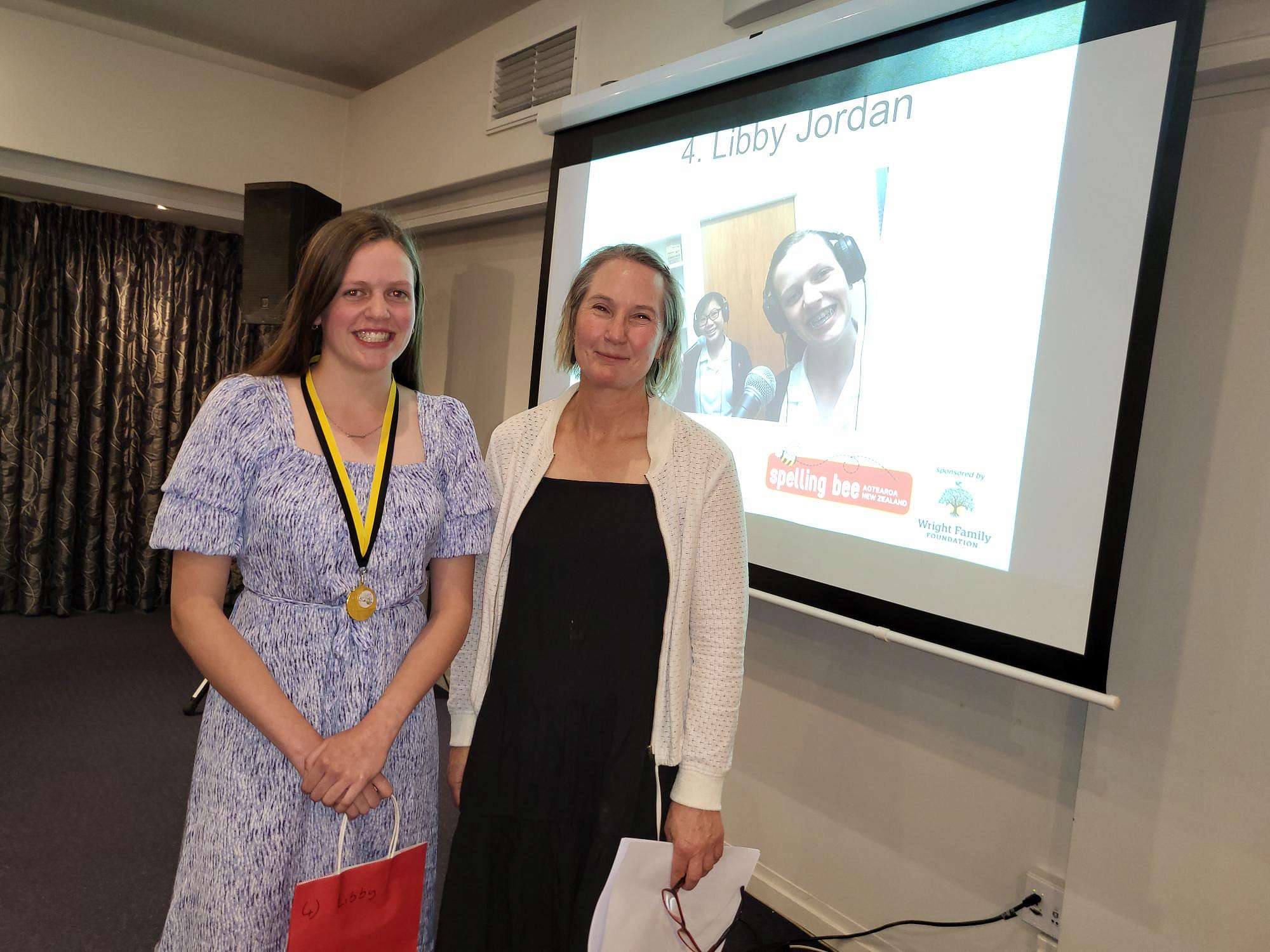 Congratulations to Libby Jordan, Year 10 who came 4th in the National Finals of the Spelling Bee contest in Wellington . There were 21 contestants from all over NZ in the finals. She is seen here being presented with her finalist medal by the Spelling Bee Programme Director, Janet Lucas at the James Cook Hotel, Wellington.