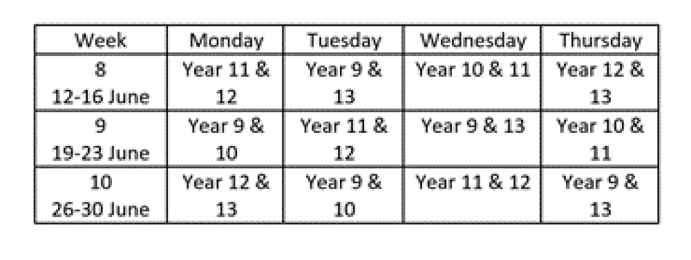 - Monday 12 June – Year 11 and 12 students rostered home.