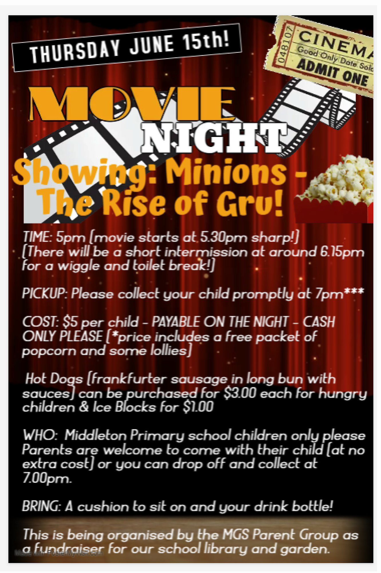 Thank you to the MGS Parent Group for organising this movie night for our primary school children. This has become an annual event that the children absolutely love. Parents and children get to enjoy a great movie – Minions - The Rise of Gru, as well as enjoy some food and fellowship. Hopefully it wasn’t too late a night for the children.