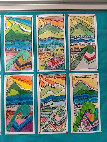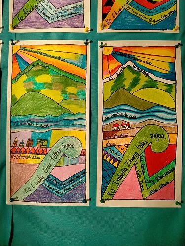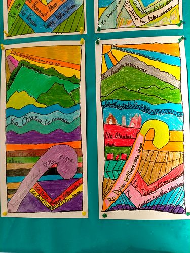 ...producing these visual representations of their pepeha. We followed the pattern that we learnt in Māori with Matua Pairama. We sketched it first, and then went over the lines and words in black vivid. We then coloured it in using coloured pencils.