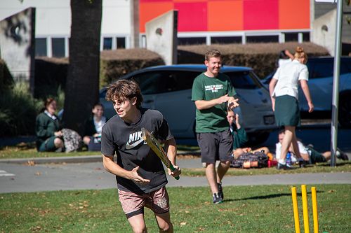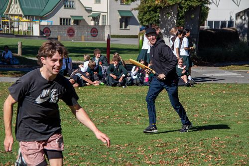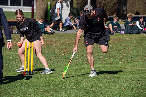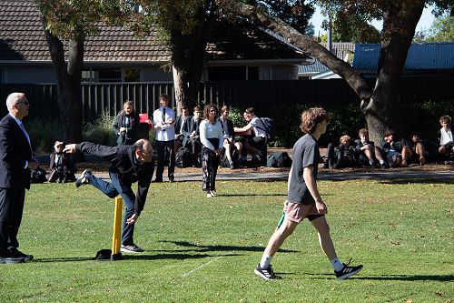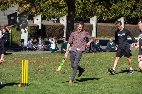 ...the annual staff vs student cricket match took place at the historic D-block oval cricket ground. Despite the pitch appearing green and greasy the student team headed up by Ben Hentschel still managed to send Mr Craig Utting's half trackers all over the park. The combination of the shiny rubber ball and the introduction of swing specialists Mr Steve Checketts, Mr Peter Collier and Mr Scott Aitken started to bring the staff back into the game. Debutant teacher Mrs Francis Malcom bowled an outstanding double wicket maiden to put the pressure back onto the students. A few key boundaries from Yone Stander and Alan Hill towards the end of the innings got the students to 67 off 8 overs.