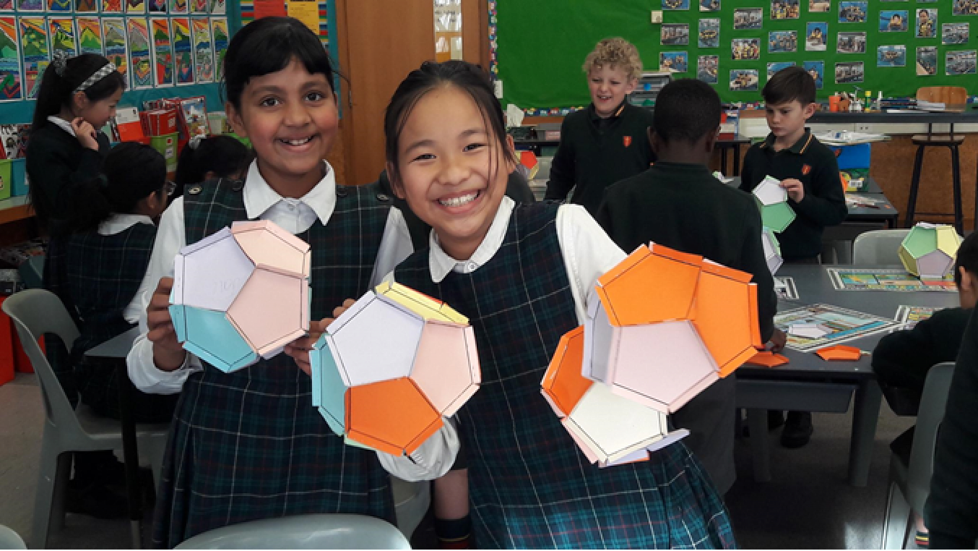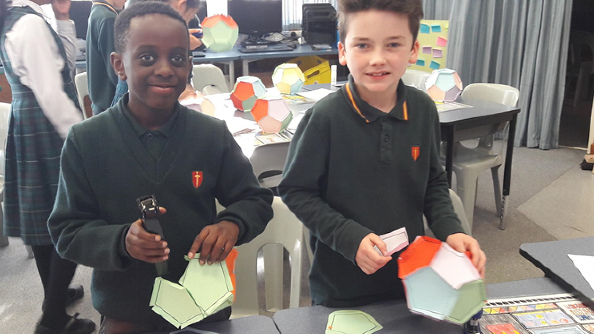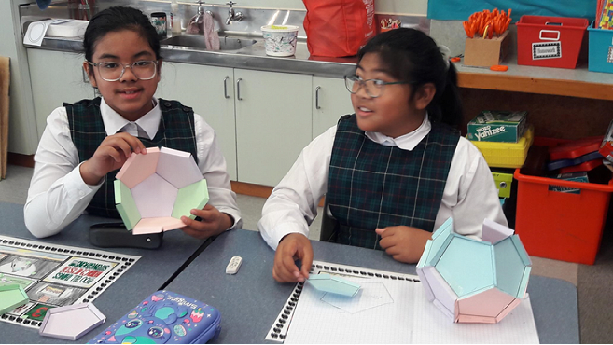 Room 13 students have been learning about the five regular solid - 3D shapes that have the same shapes on all of their faces. These include the tetrahedron, cube, octahedron, dodecahedron and lcosahedron. In these photos, students are constructing the dodecahedron, a 12-sided solid that has a pentagon on each face. This was a tricky exercise, but with patience and care everyone managed to construct one out of cardboard.
