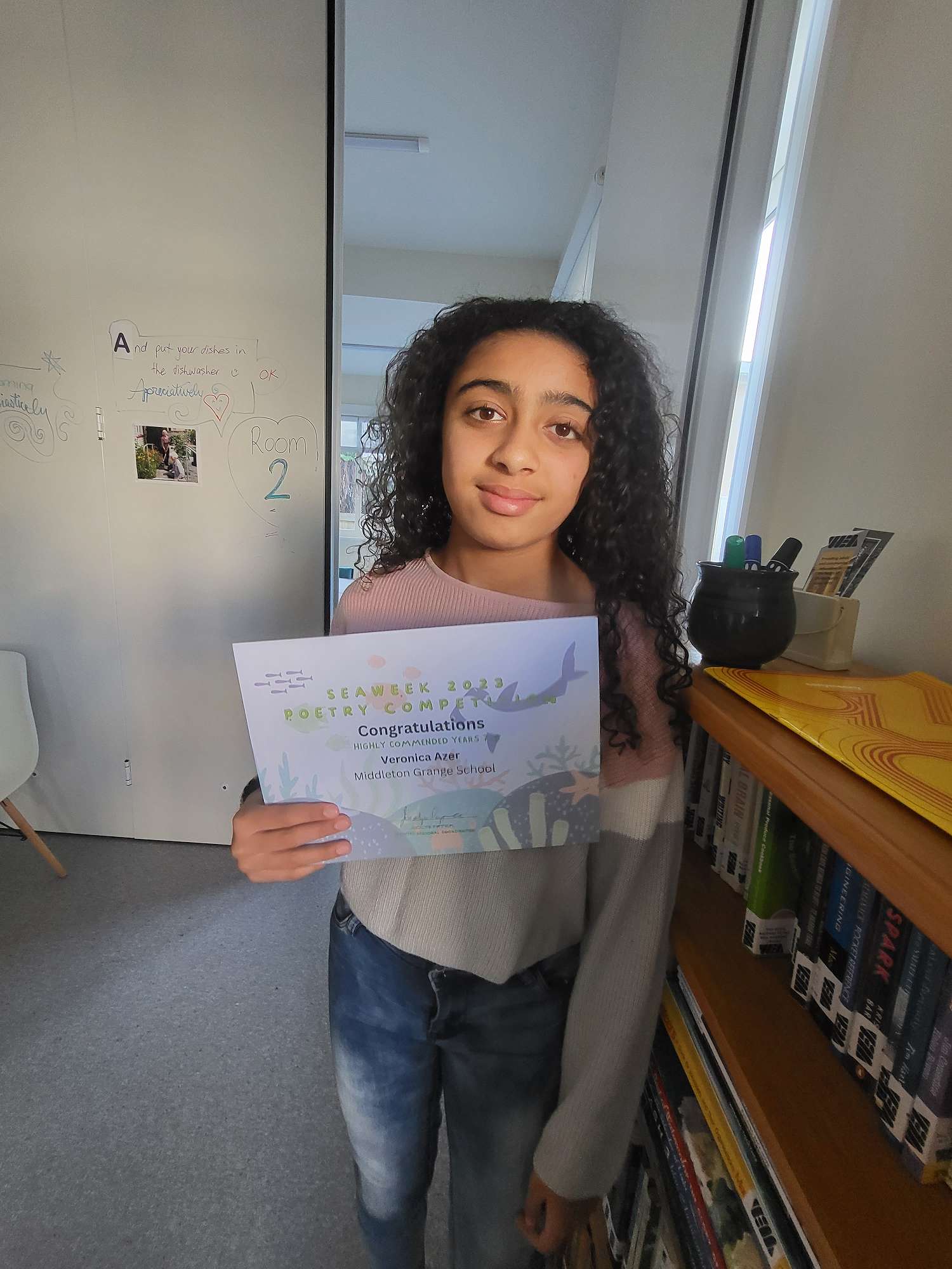 Congratulations to Veronica Azer in year 8 for getting Highly Commended for the poem she entered in the Seaweek Poetry competition entitled Senses of the Sea. There were 150 entries and only five awards in this section.