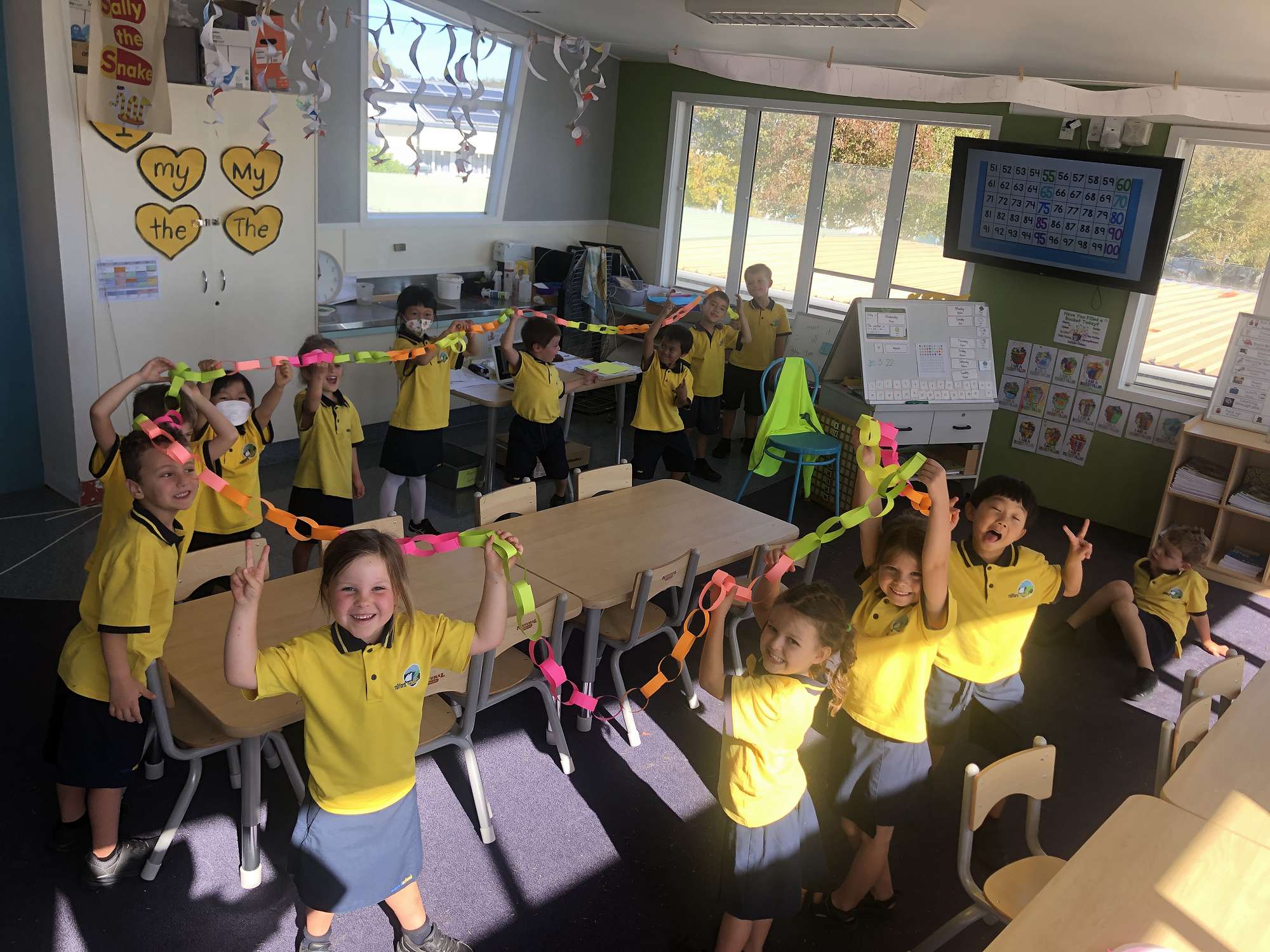 Room 17 has been learning to count in 5s. When our visitors came on Wednesday morning, we created colourful paper chains in 5s, and linked everyone's chains together. Our curious minds wondered "How many rings are in this long chain altogether?". To investigate the question, we counted in 5s and found out that there were 145 rings in the paper chain. We are proud of our beautiful creation and our fantastic skip counting skills. Ka pai Room 17!