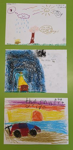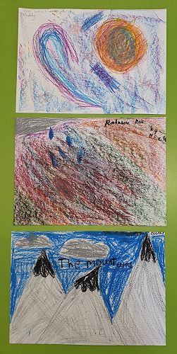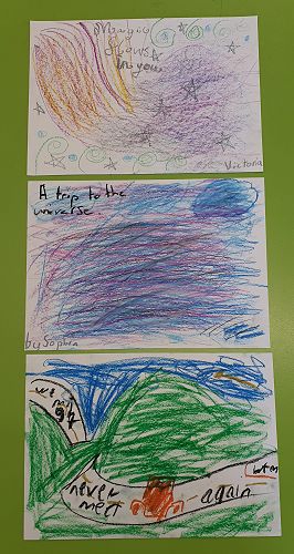 One of the ways we expressed ourselves was by creating artwork inspired by music. The students listened to three different songs and were encouraged to think about the emotions they felt while listening, and to put those emotions into their artwork. We discussed how whatever emotions we felt were okay as we're all different and have different points of views. The students also enjoyed coming up with a title to accompany their artwork.