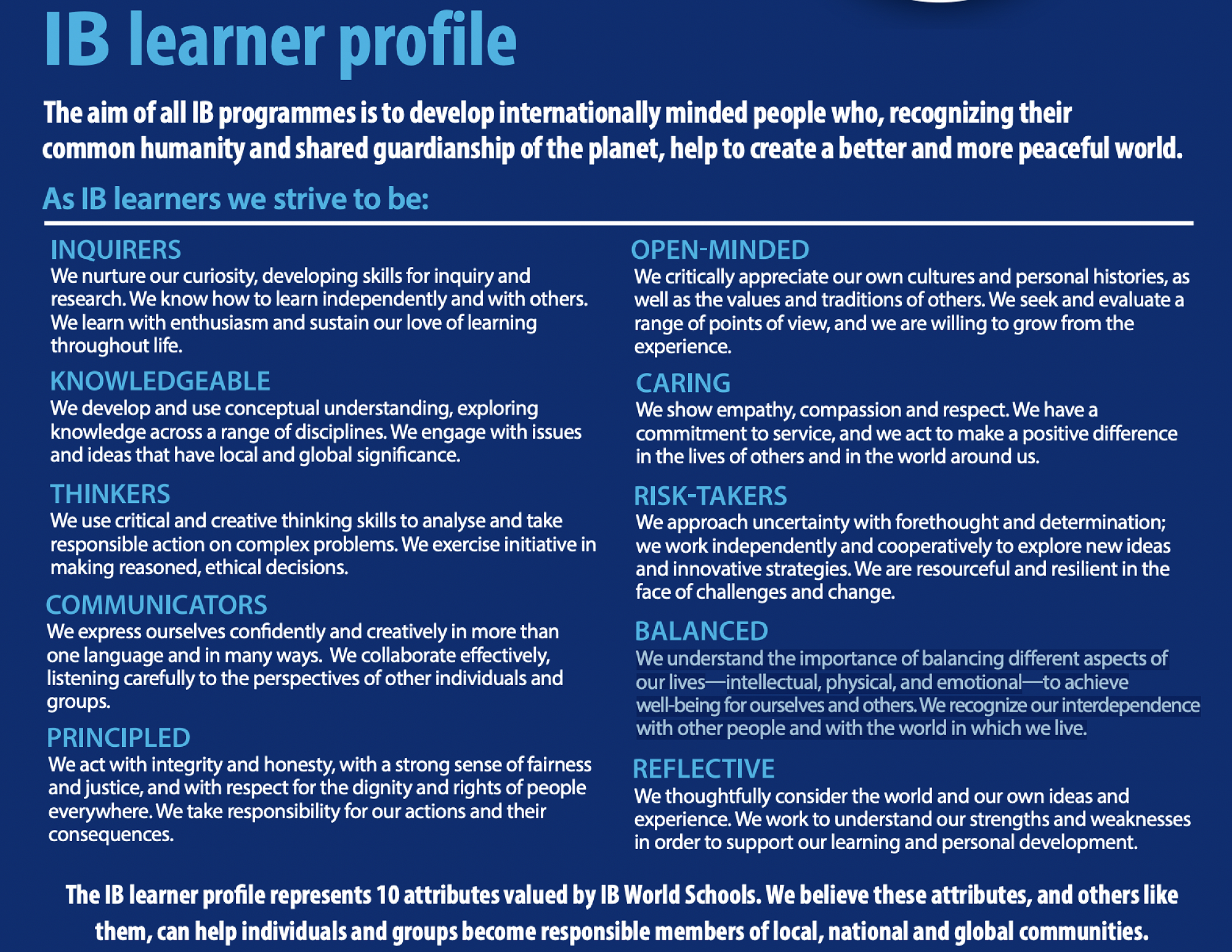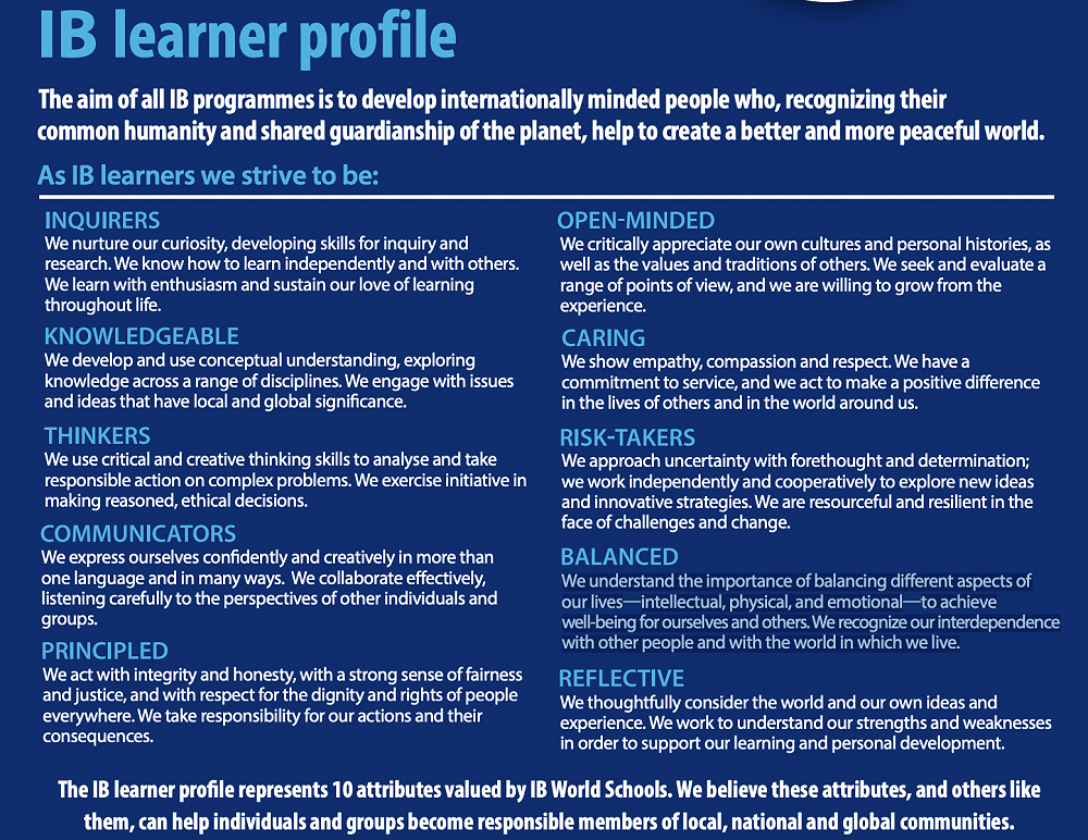 This group of talented learners came to my office to share a dance they had choreographed and practised themselves. They said that the song (Waka Waka - This Time For Africa, by Shakira) was one of their fitness songs, and they had enjoyed it so much they made up the dance. They have decided to make up a dance for every new song each week so I am looking forward to seeing them again! Being balanced is about understanding the importance of balancing different aspects of our lives—intellectual, physical, and emotional—to achieve well-being for ourselves and others. These motivated and creative learners are certainly enjoying a balance in their school lives! Want to check out the ten attributes of the Learner Profile in PYP? See the attached photo. Chat to your children about the attributes and see if they can name times they showed an attribute in the way they thought, spoke or acted.