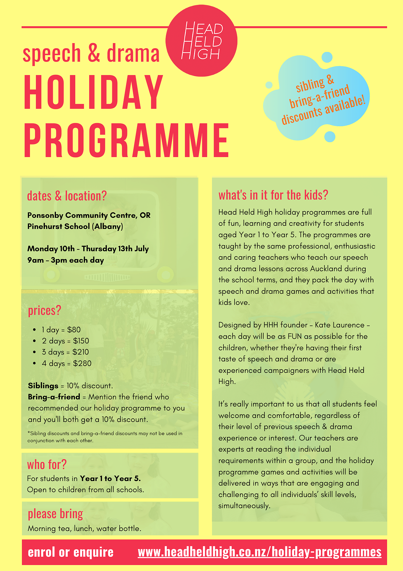 Head Held High holiday programmes are full of fun, learning and creativity for students aged Year 1 to Year 5. The programmes are taught by the same professional, enthusiastic and caring teachers who teach our speech and drama lessons across Auckland during the school terms, and they pack the day with speech and drama games and activities that kids love.