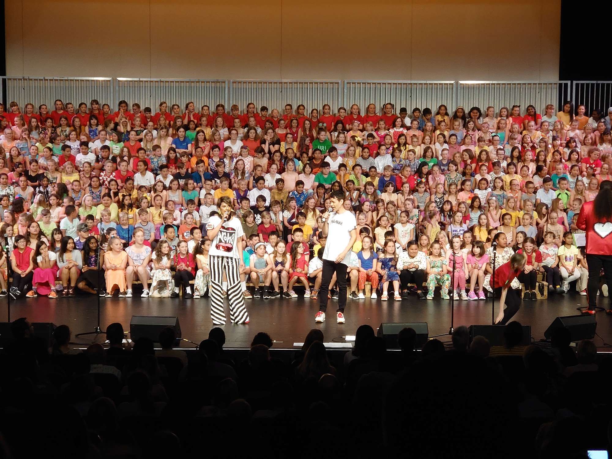 The massed choir on Thursday night consisted of approximately 550 children from many schools . This was the last performance for 2019 as Jackie and Nathan have spent 13 weeks at various venues across New Zealand.