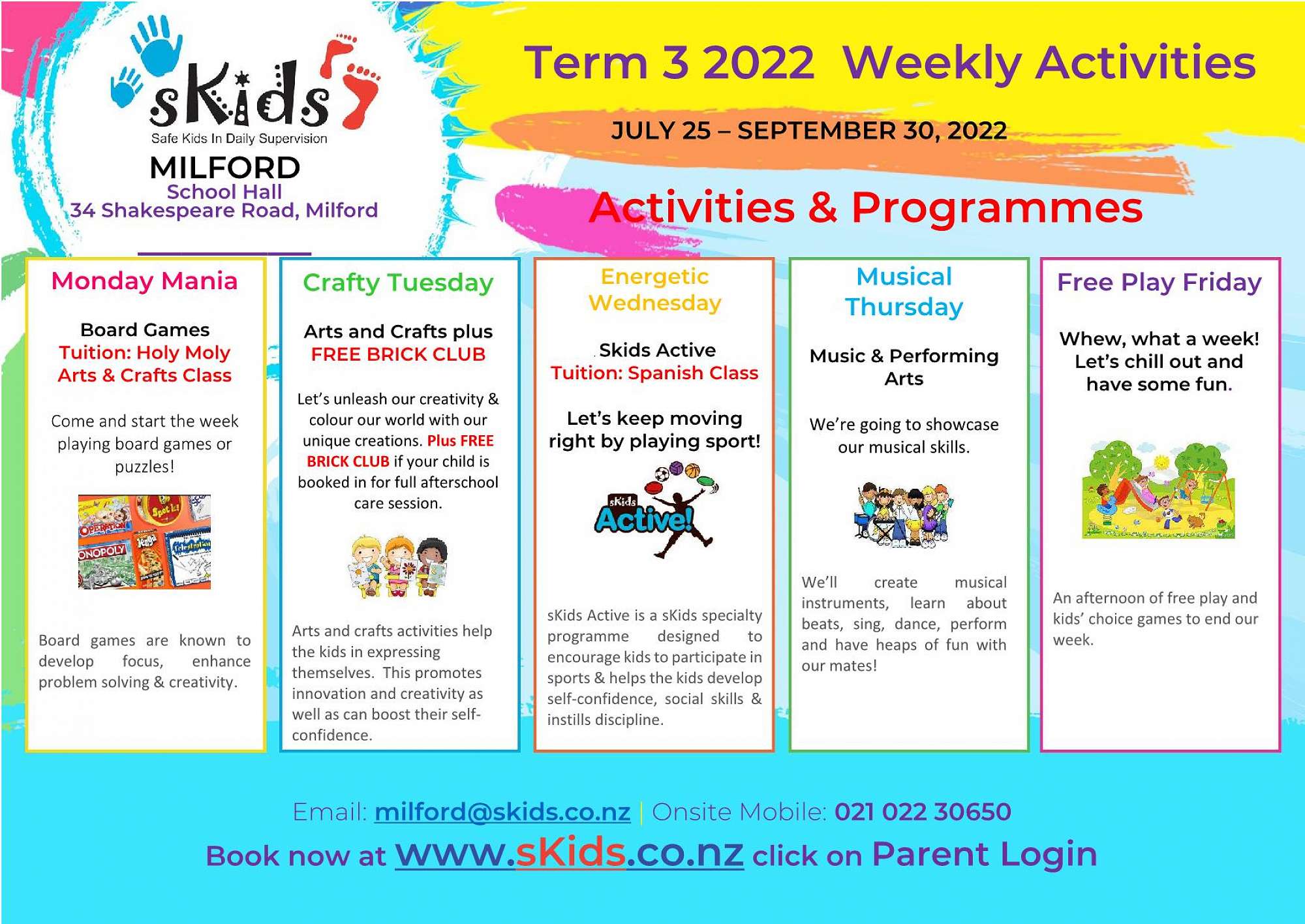 See attached enrolment information for Skids before and after school programme, including their weekly activity plan for Term 3.