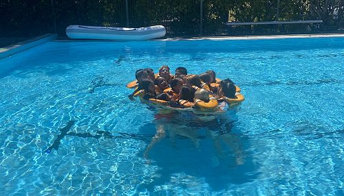Once we were in the pool we tried the 3 safety swims with life jackets. 1 is doggy paddles, 2 is safety backstroke you cross your arm and kick lightly, and 3 is breaststroke. Then we went in a chain and swam across the pool. After that we tried some shapes to float, first was a T then an I shape, even though it was hard to keep our heads above the water. Then, a Y, and the easiest one is a star. After that, we went to the boat we all slowly got in.