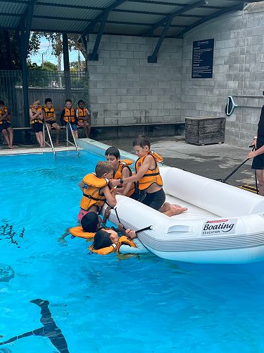 Then they showed us the help position is when you cross your arms and cross your legs and don’t move or you will get cold. Then we headed to the pool. First Room 5 went then Room 6 and finally Room 7. When we first got there so many life jackets were lying on the ground. The safety instructions were zip and buckle, hand under the strap to check if tight and lastly thumbs under shoulder straps to see if it's too big or too small that was how we put them on they were cold and soggy. Then half the class went to the inflatable boat and the other half went in the water.