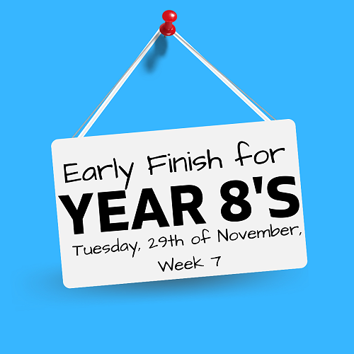 On Tuesday, 29th of November, Week 7, all year 8 students will finish school early at 12:30 pm. All year 6 students enrolled for 2023 will arrive for orientation day at 1:00 pm. Year 7 students will finish school at the usual time.
