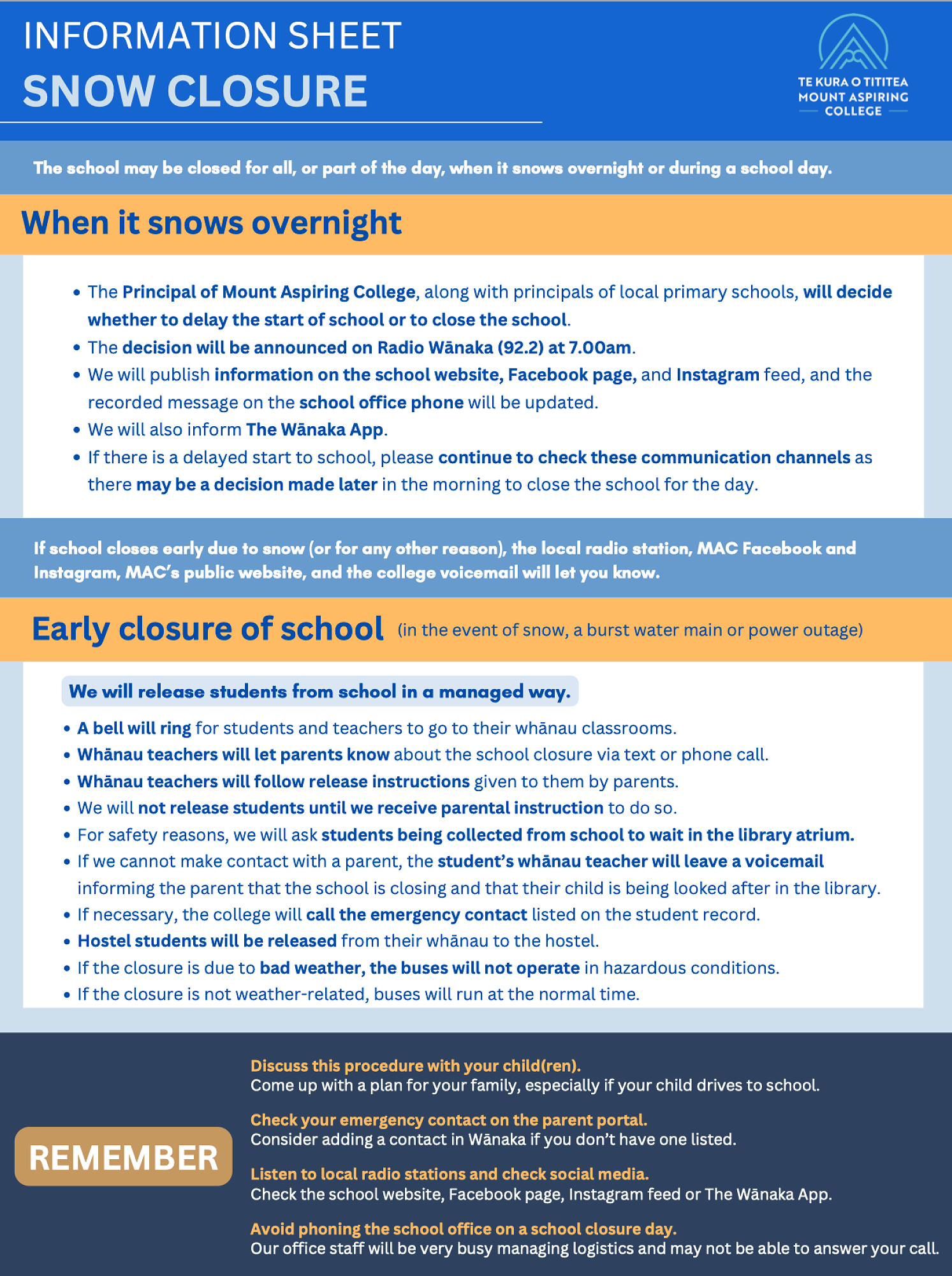 Please let us know about sickness/appointments/late arrivals/other absences from school at: absence@mtaspiring.school.nz