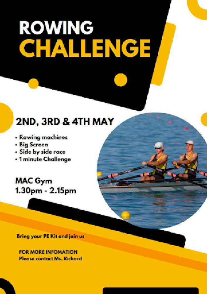 Are you interested in trying out rowing? All students are invited to come along to our rowing challenge in the gym at lunchtime next week on Tuesday the 2nd, Wednesday the 3rd and Thursday the 4th of May. Ergometers will be connected to the big screen so students can ‘give it a go’ and race against each other.