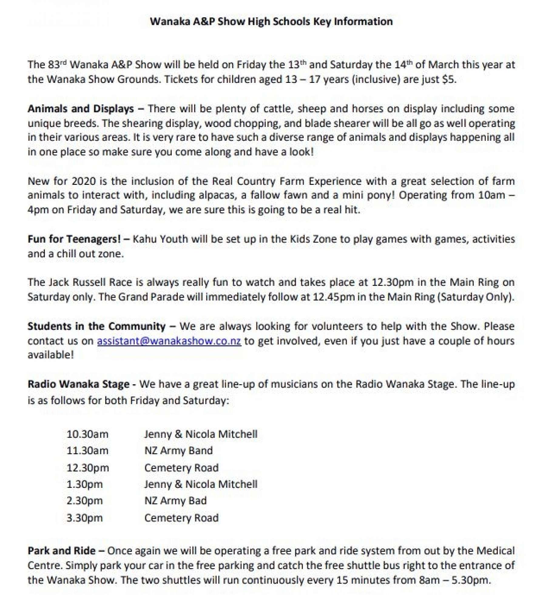 Make life easy by using the free Park n' Ride and enjoy free sunblock and water at the Show. Tickets can be purchased online at www.wanakashow.co.nz or at the gate for $17.50 per adult and $5 per youth (13-17 years) per day. Children aged 12 and under are free.