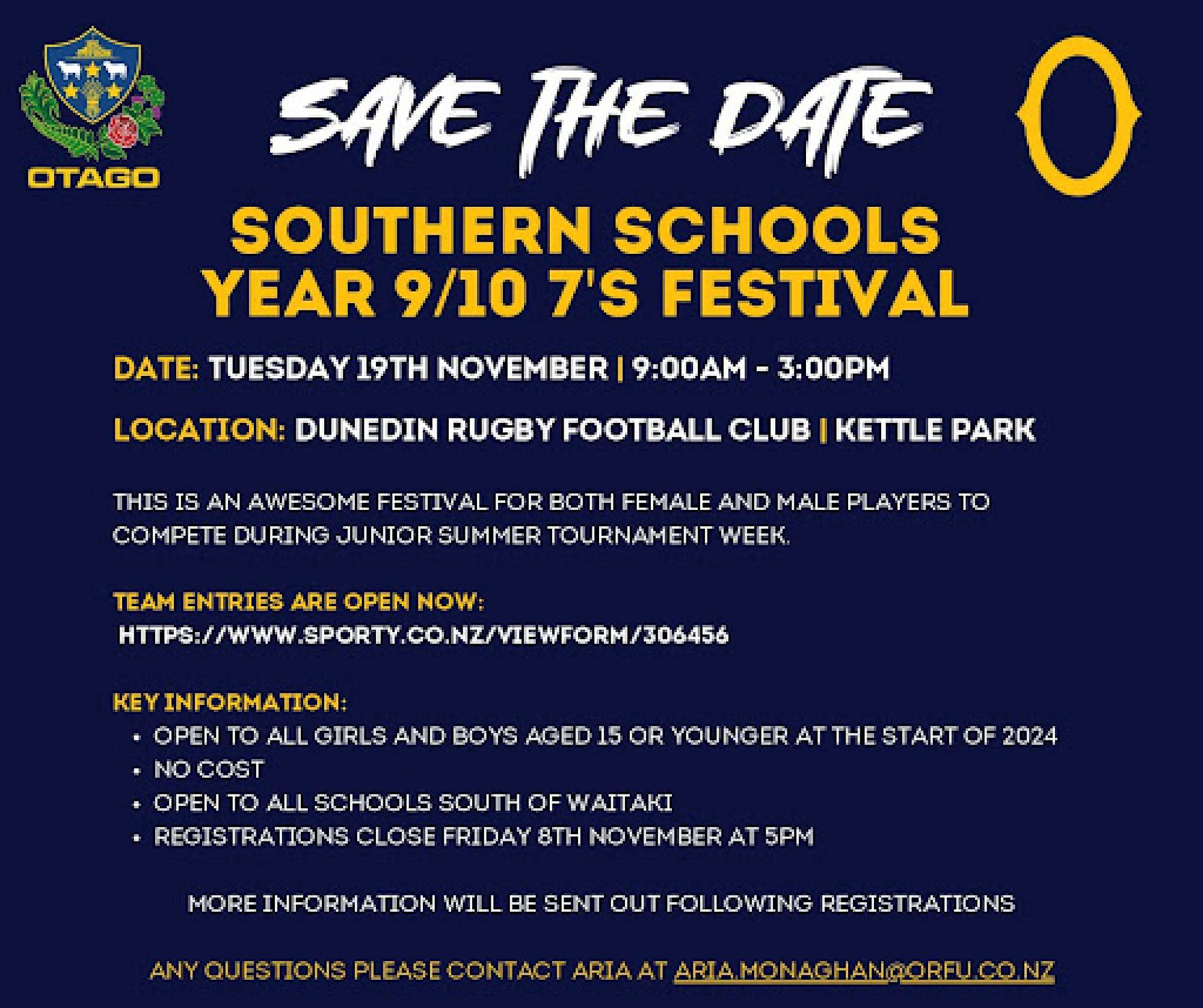 Otago Rugby are excited to be hosting the Southern Schools Year 9/10s 7's Tournament.