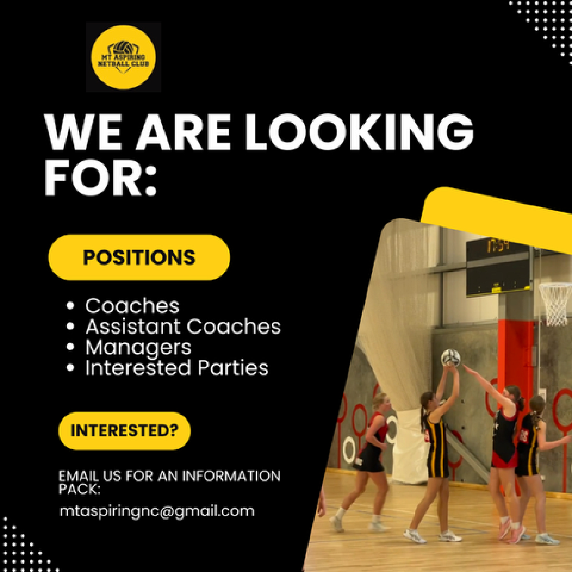Do you have a passion for netball and a desire to help shape the future of our up-and-coming Silver Ferns? Mt Aspiring Netball Club is on the lookout for coaches, assistant coaches, managers, and interested parties for teams from Year 7 to Year 13.