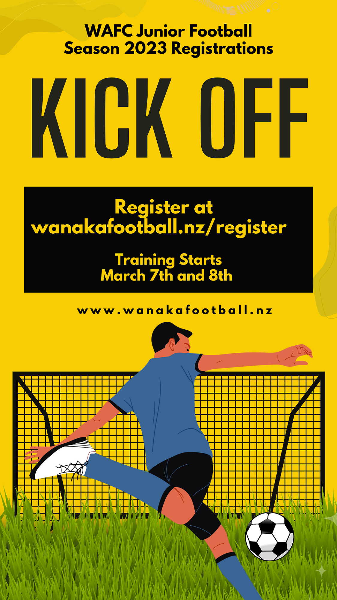 To register, go to wanakafootball.nz/register. If you've previously registered, click on the green 'Current or Past Member of Wanaka AFC'. If you're new to the club this year, or would like to register for the 'Come and Try', click on the blue 'New to Wanaka AFC'. Training starts on 7 March (U9-U10 & U15-17) or 8 March (U6-U8 & U11-U13) so we look forward to seeing you then! More details can be found at wanakafootball.nz/training Any questions, please email info@wanakafootball.nz