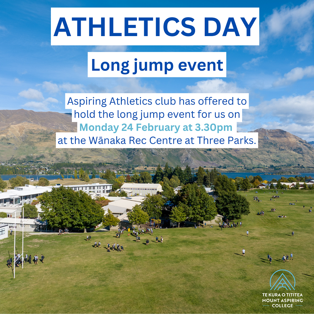 We are very grateful to the Aspiring Athletics club which has offered to hold the long jump event for us on Monday 24 February at 3.30pm at the Wānaka Rec Centre at Three Parks.