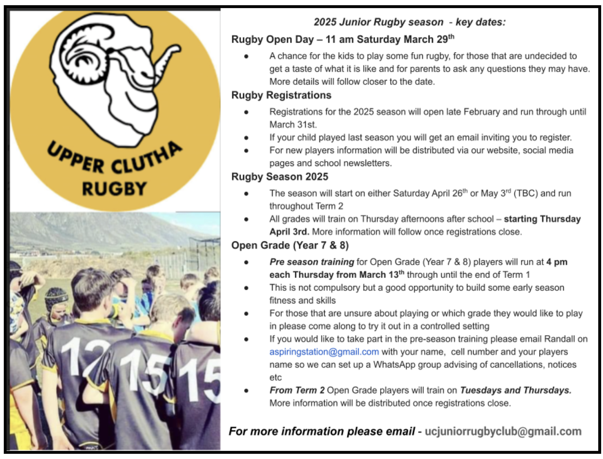 What to bring: rugby boots, mouth guard, water bottle.