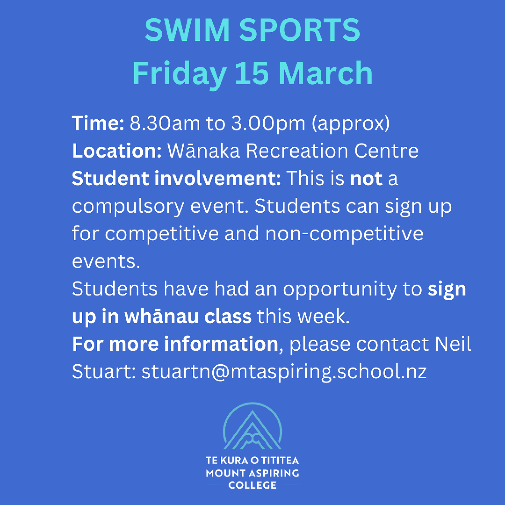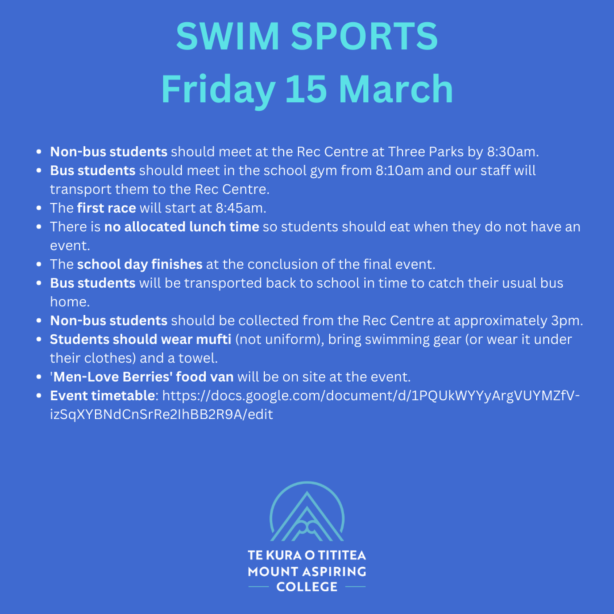 Our annual Swim Sports day is coming up on Friday 15 March. You can check out the details in an email from our Head of Learning Area - Health and Physical Education Neil Stuart sent to parents and caregivers on Wednesday 6 March, and you can read the event timetable here.