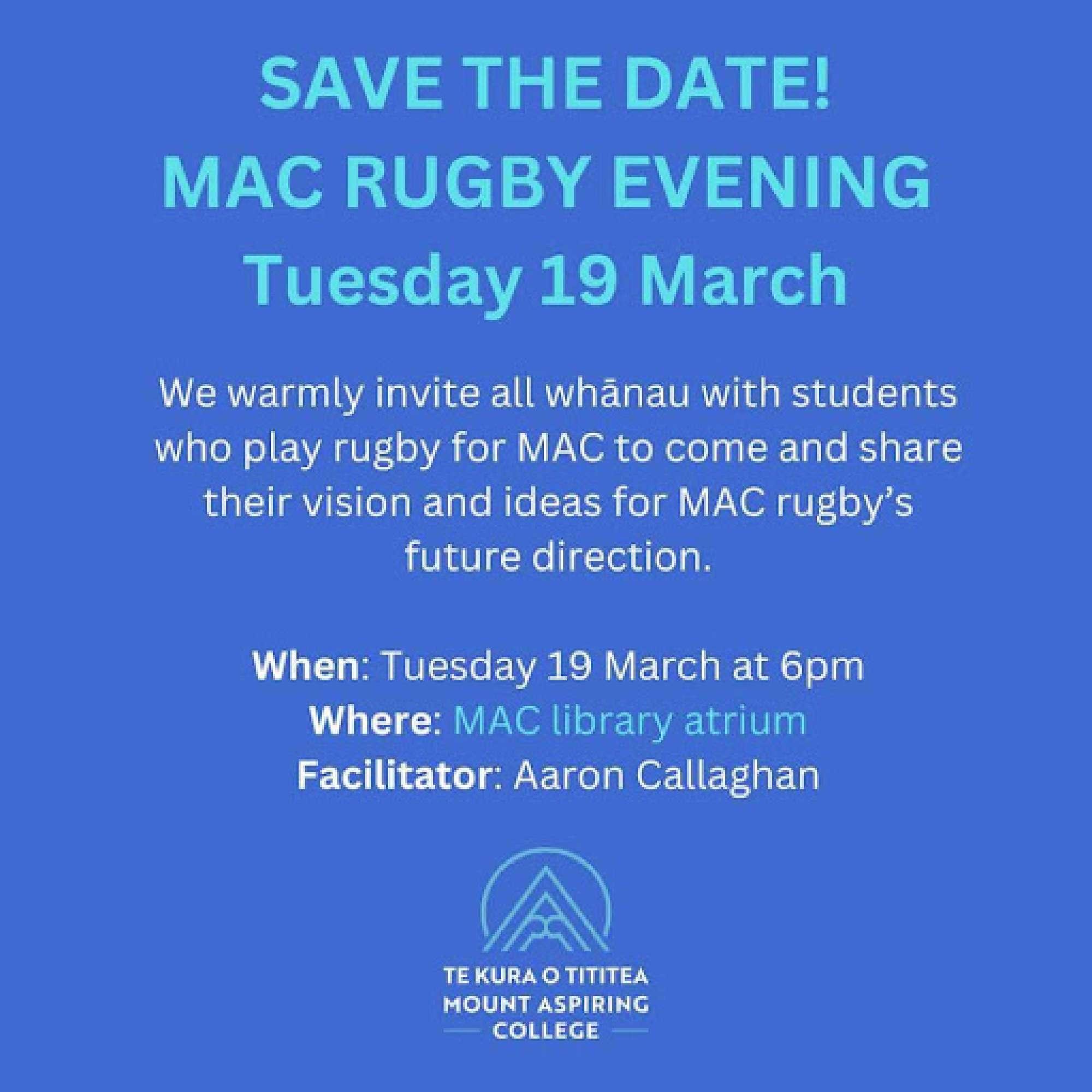 MAC rugby registrations are now due for all Years 9-13 players. Please visit https://www.sporty.co.nz/viewform/256690 to register.