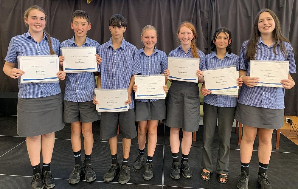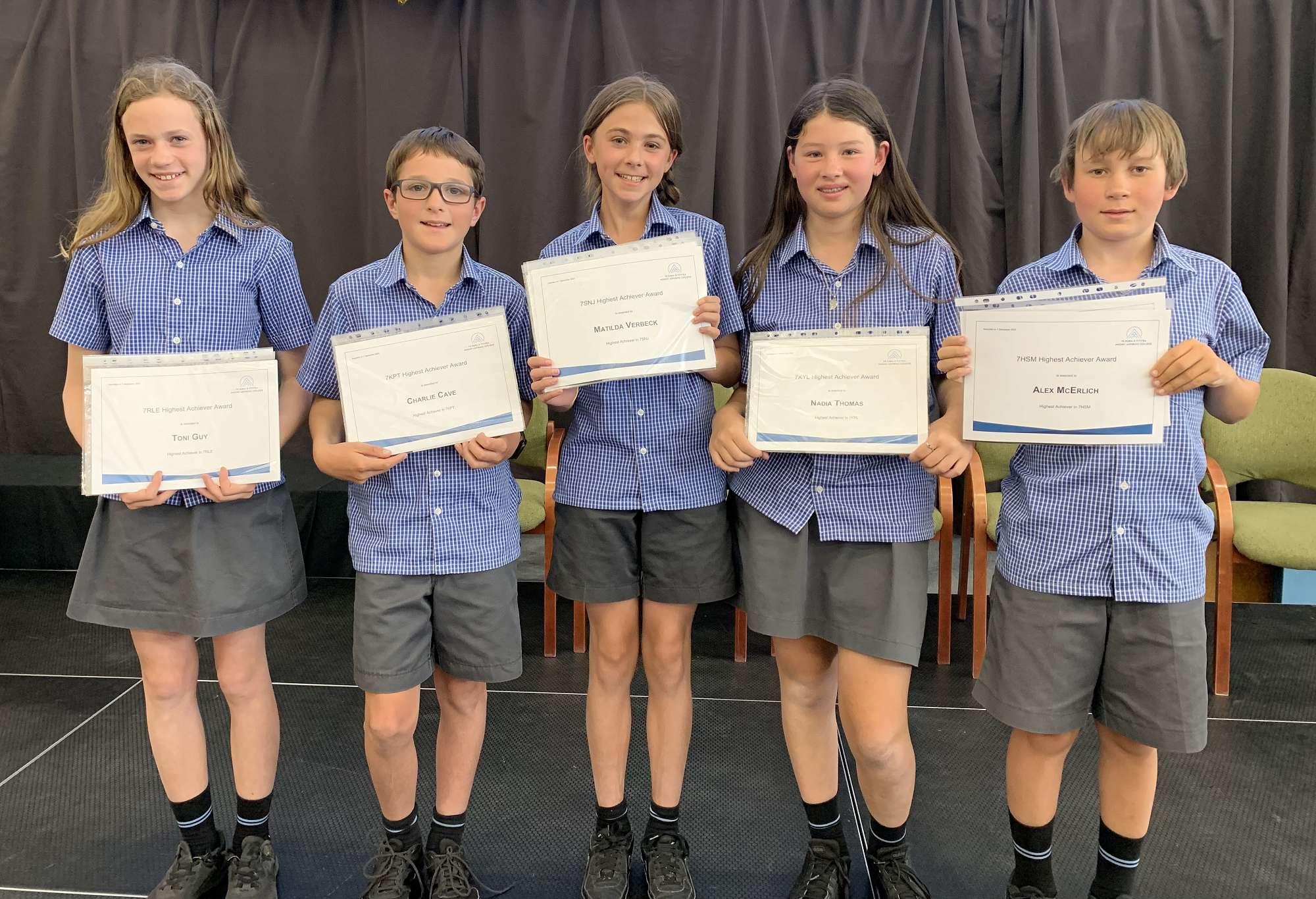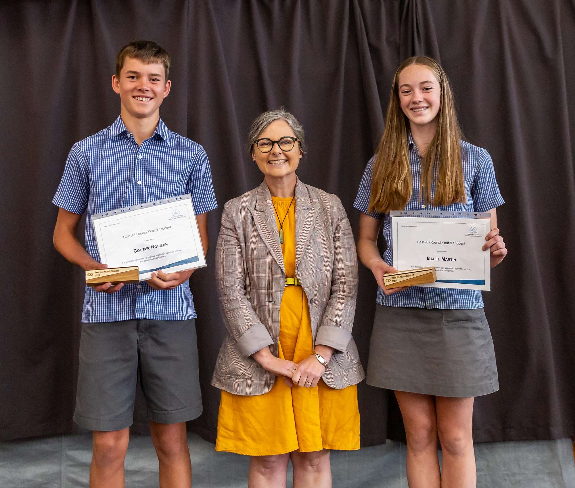2023 Best all round students (L-R) Elliot Lovelock (Y7), Alice Chaly (Y7), Principal Nicola Jacobsen, Sammy Watkins (Y8), Holly Radford (Y8)