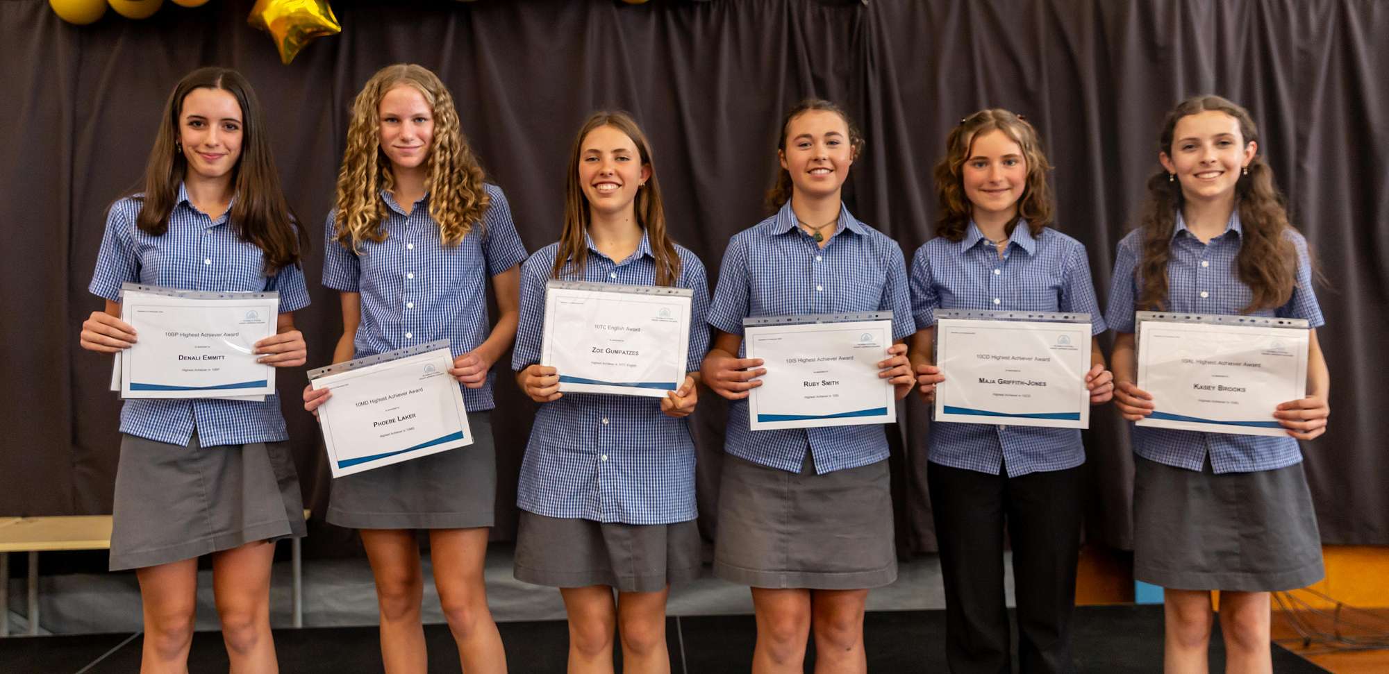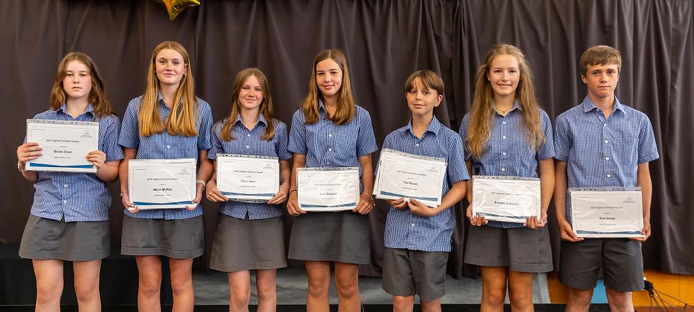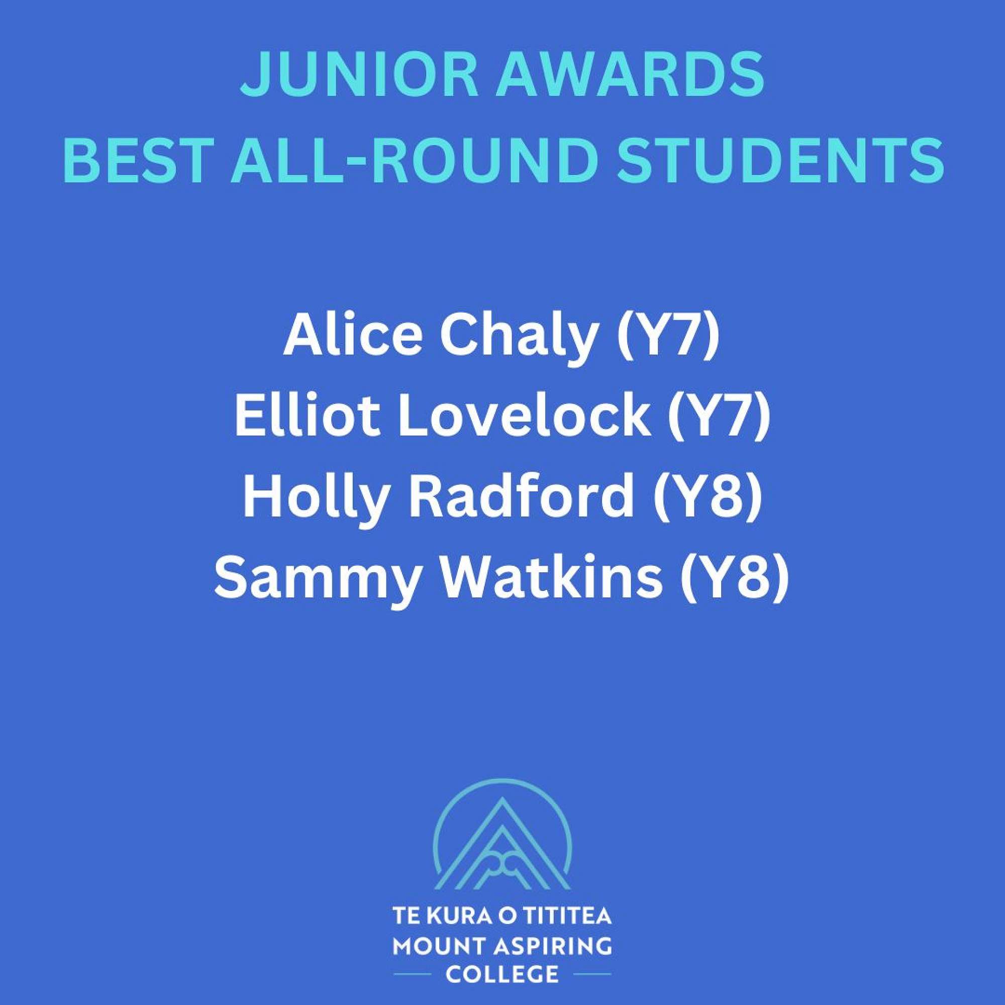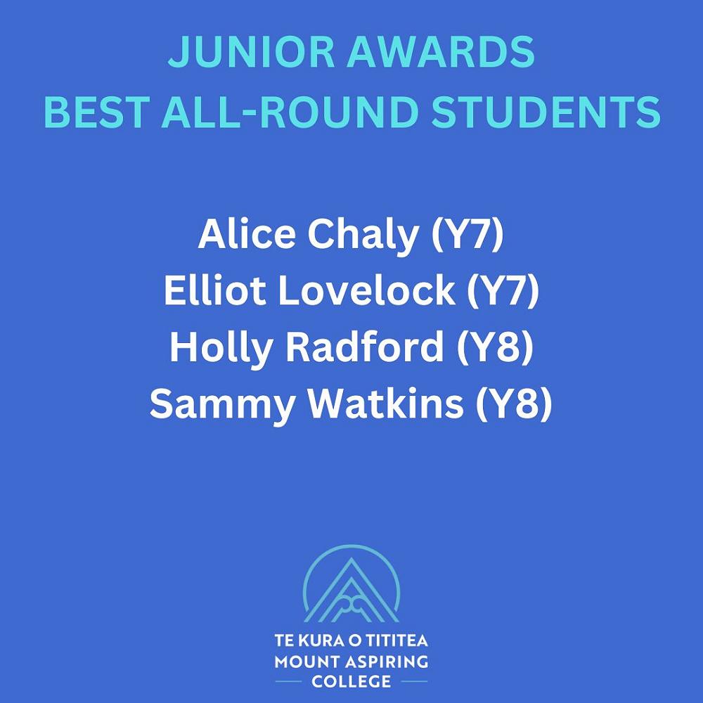 2023 Best all round students (L-R) Elliot Lovelock (Y7), Alice Chaly (Y7), Principal Nicola Jacobsen, Sammy Watkins (Y8), Holly Radford (Y8)