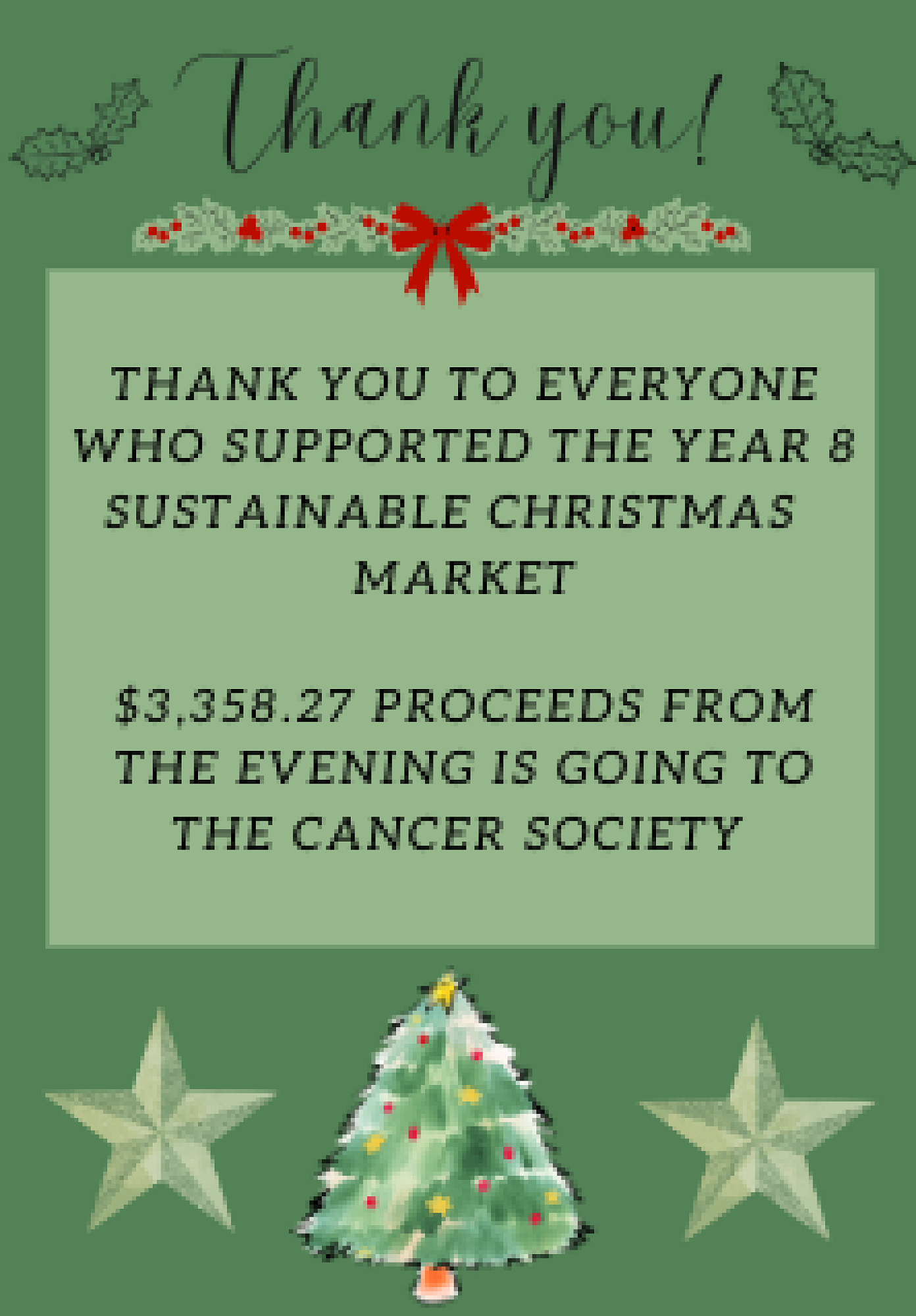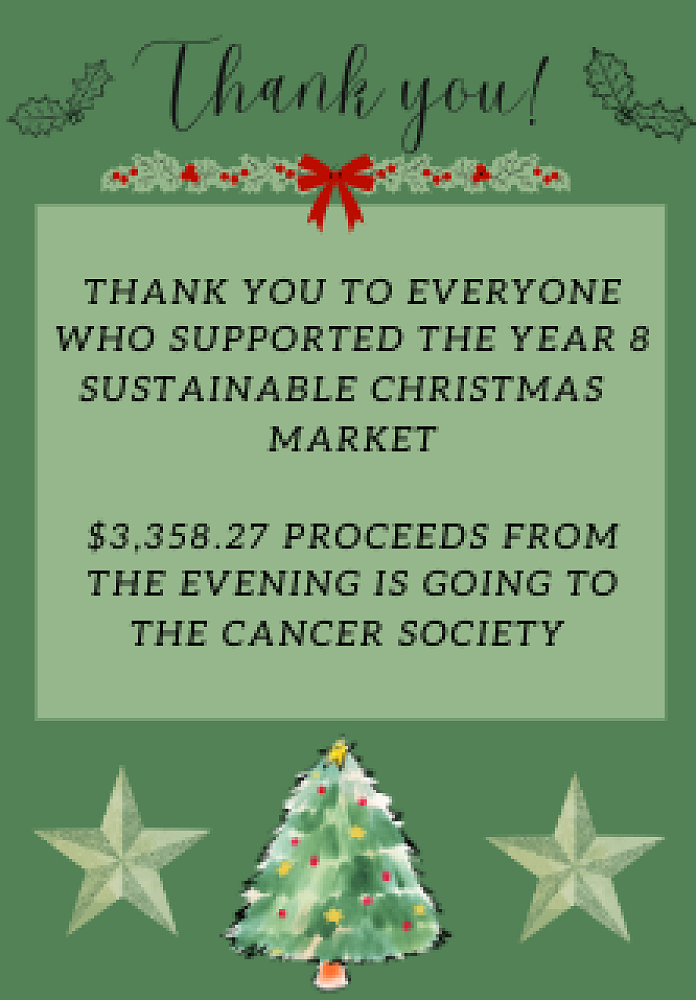 These funds were raised by our Year 8 students from sales at their Sustainable Christmas Market held last week.