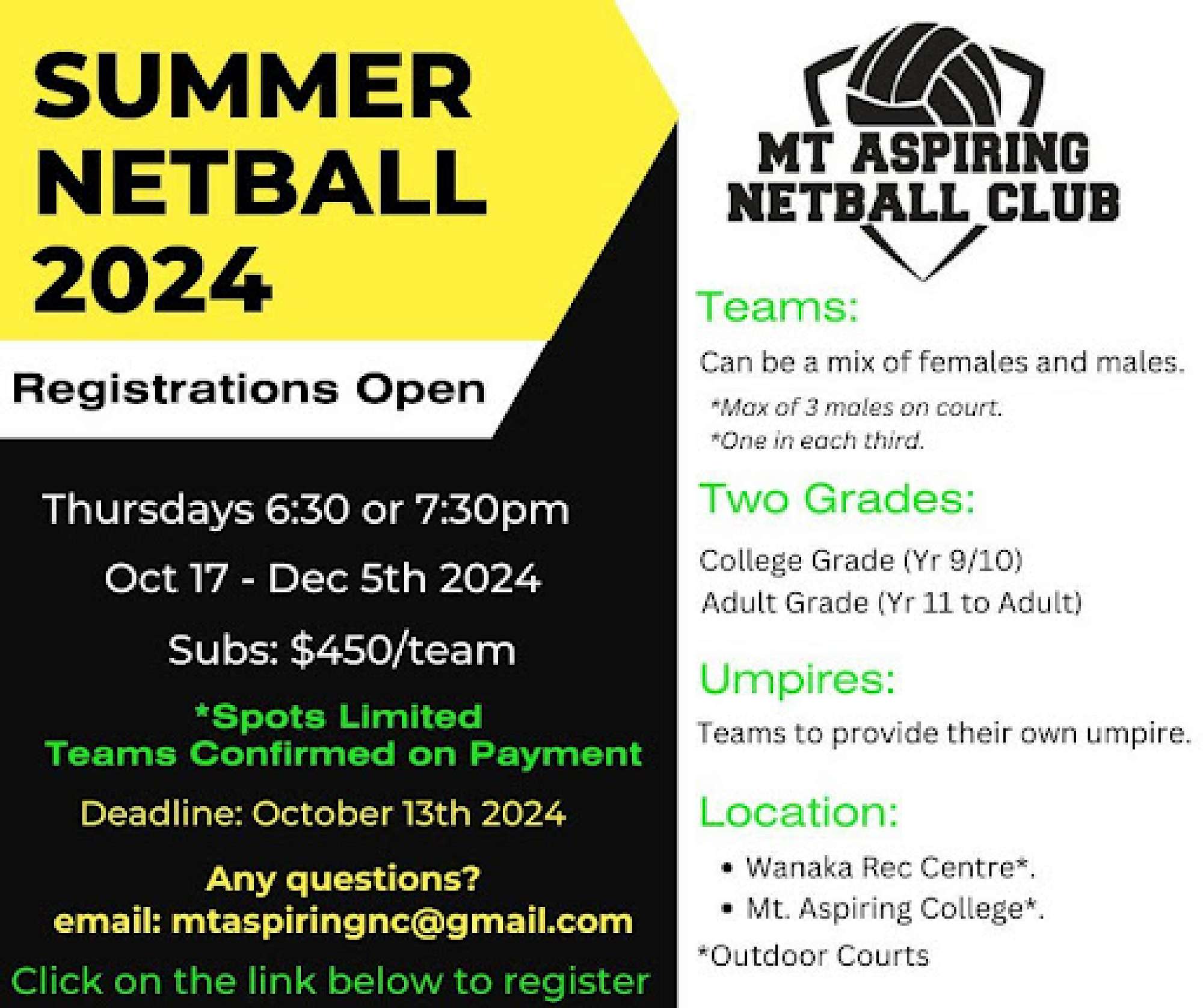The Mt Aspiring Netball club is on the lookout for coaches, assistant coaches , managers, and interested parties for teams from Year 7 to Year 13.