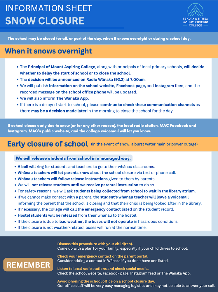 Please let us know about sickness/appointments/late arrivals/other absences from school at: absence@mtaspiring.school.nz