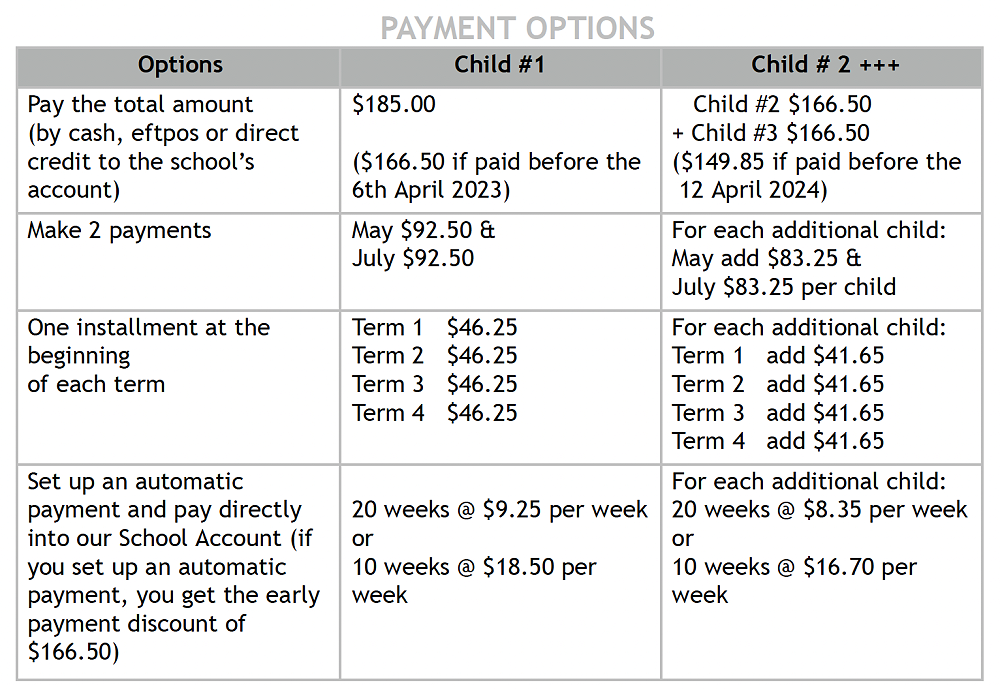 The Board of Trustees believes that parents accept the need to make a contribution towards costs not covered by Ministry funding, and has set the following donation options for you to choose from this year: