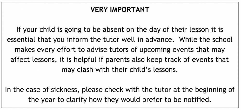 Please liaise directly with your child’s music or language tutor throughout the year. This includes all queries, concerns, absentee notifications and other messages. Avoid asking office staff to pass messages on to tutors.