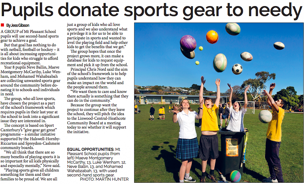 "Give Gear, Get Great" - Luke, Mohamad, Maeve and Neve attended a Linwood Central - Heathcote Community Board meeting to present their action around collecting sports equipment that is surplus to redistribute to children who don't currently have access to it. The Community Board has agreed to support this initiative. They also appeared in the Bay Harbour News!