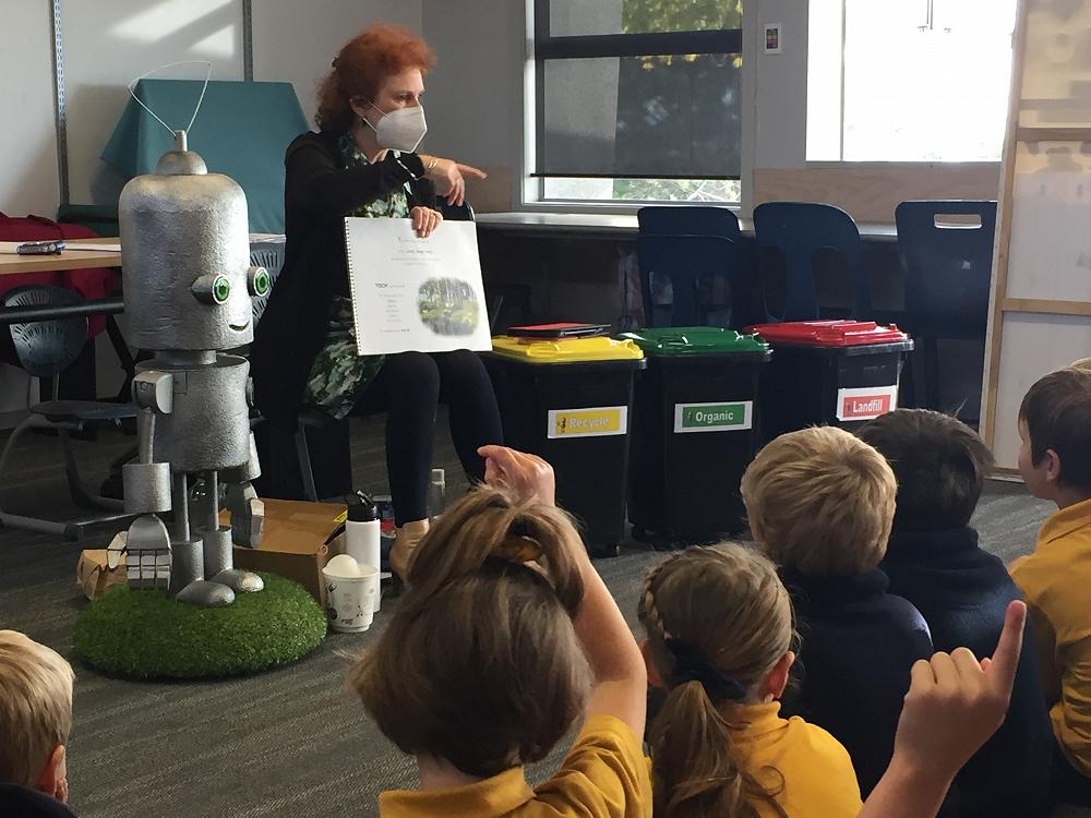 Tock is trying to save the world. June did a song and a story. ALL lids go into the red bin. Compost should go into the green bin. Milk cartons go in the yellow bin.