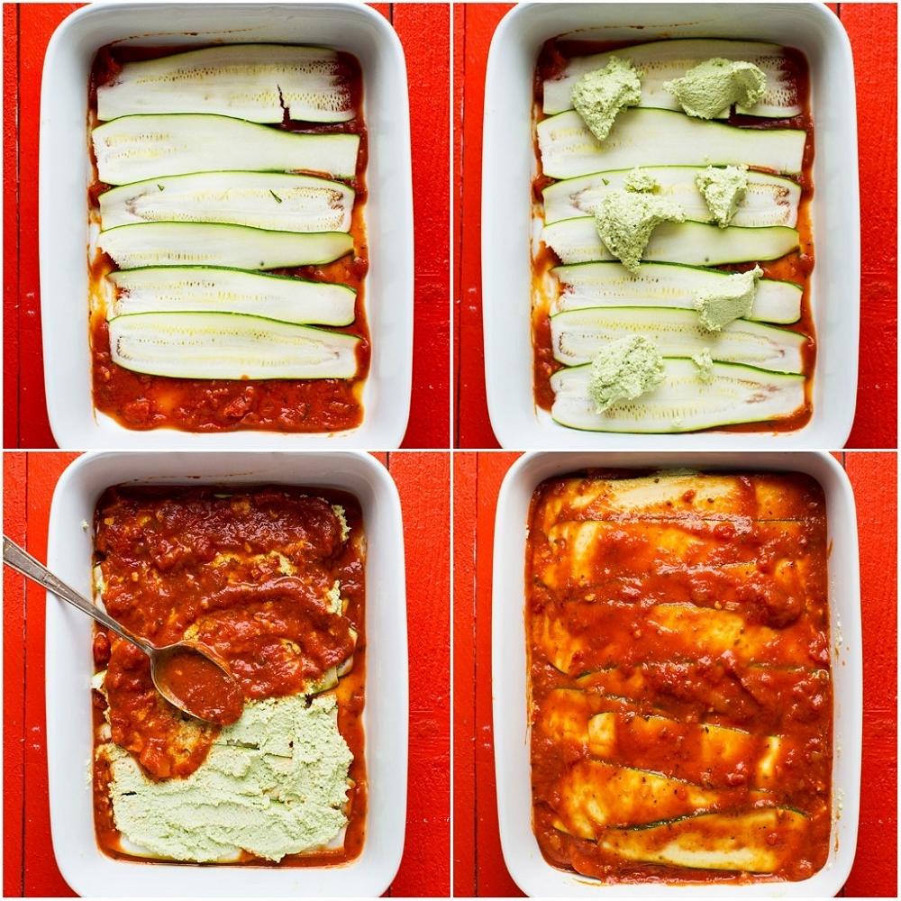 This recipe tastes great because you get this nice acidity from the tomato sauce. The vegan ricotta is very light, rich and creamy, and you get this pungent and sweet smell from the freshness of the basil. The zucchini/eggplant will give a you the veggie vibe and texture to the dish especially if its crisped up. Baking it in the oven will give it a nice toast which gives this meal another different flavour.