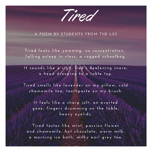 Ms Taigel has been teaching creative writing in the LSC. Last week students worked together to create a sensory poem.