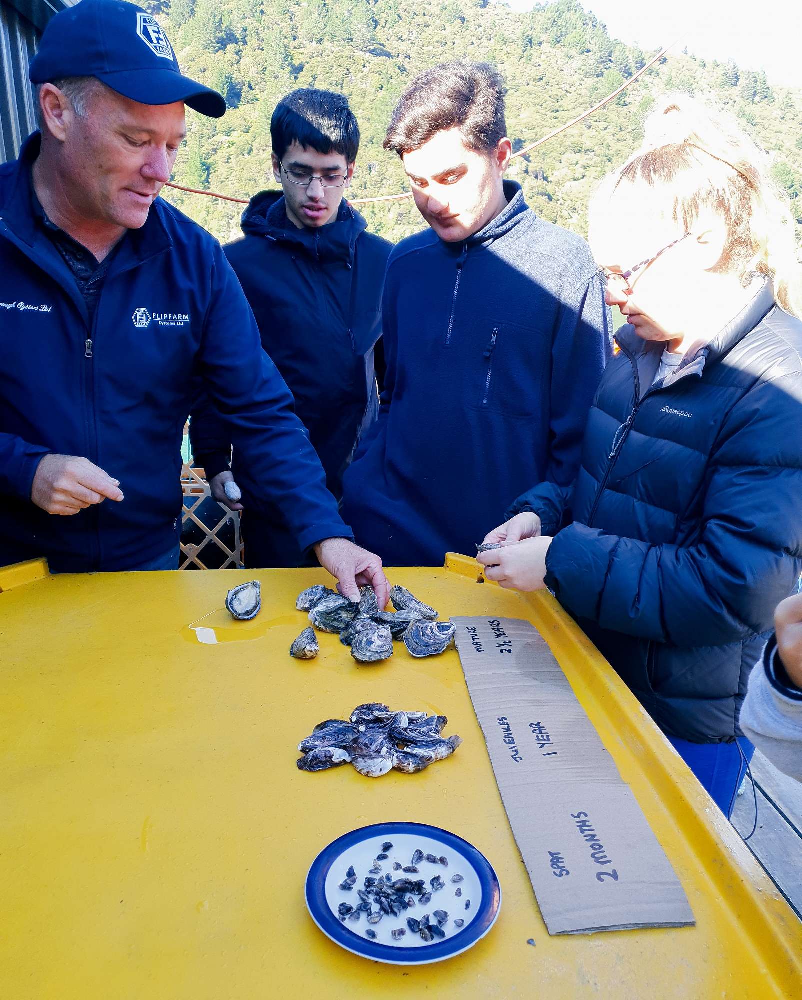 With skipper Kris Solly at the helm it took about an hour to get to Whakitenga Bay where the students got to see a world leading oyster farm in action. On the journey we were treated to the sight of dolphins and gannets busily fishing. Aaron Pannell of Flip Farm explained how he came up with some revolutionary solutions to some of the problems traditional oyster farming has suffered from https://www.flipfarm.co.nz/.