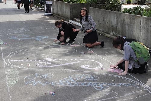 Monday was about art, with students having the opportunity to take part in Harakeke weaving. Students were also able to contribute to chalk art on the central driveway, helping to colour in an enlarged version of the school’s Kowhaiwhai pattern that features in our library.