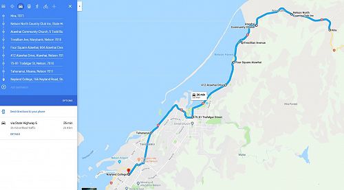 The proposed route will start at the Hira shops at 7.30 am. The bus will travel into Nelson as far as the i-site, then travel down Rocks Road and Tahunanui Drive towards Nayland via Quarantine road. Attached to this article is a picture of the intended route and it can also be accessed via this link https://goo.gl/maps/3EeYWr9vGj92 with some proposed stops.