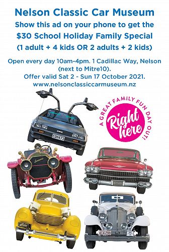 Print out the flyer and take it with you to get the $30 school holiday family special. Open every day 10am-4pm. 1 Cadillac Way, Nelson. Offer valid 2-17 October 2021. www.nelsonclassiccarmuseum.nz