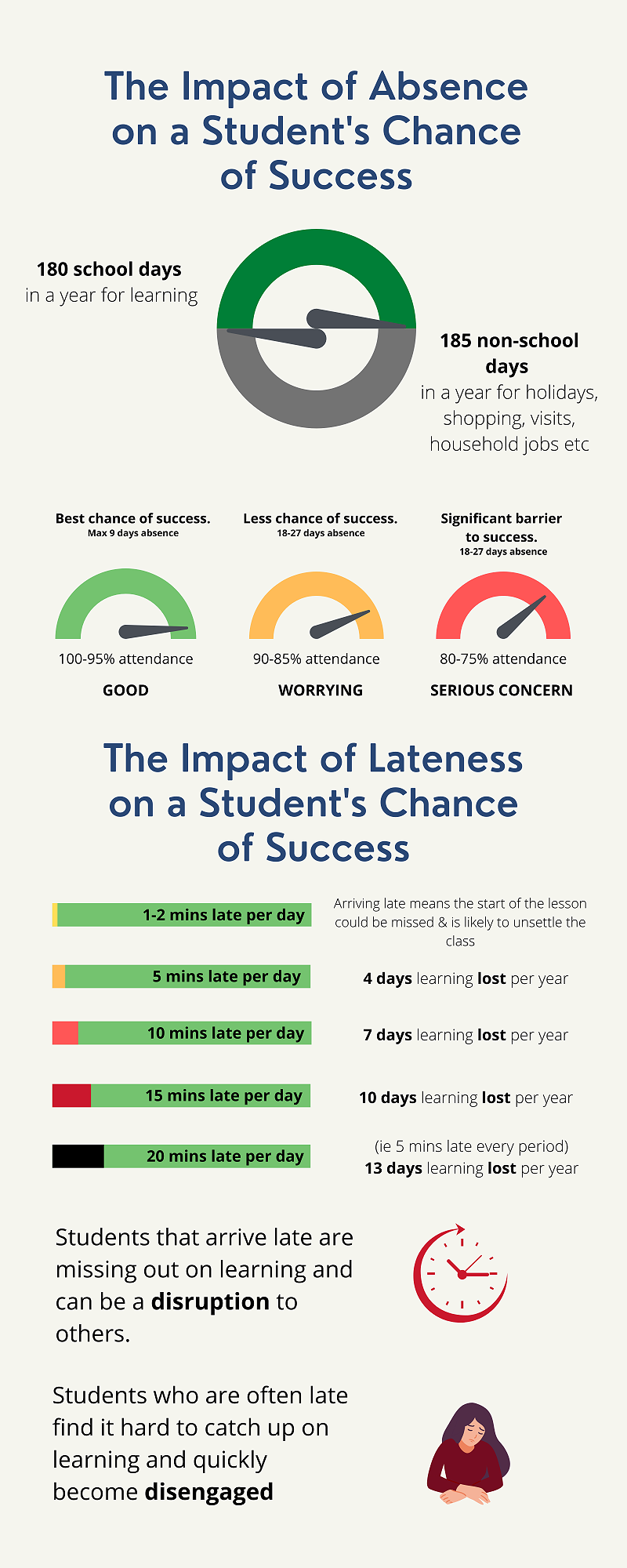 Being absent, late to school and late to class can have a significant impact upon a student’s chance of success at school.