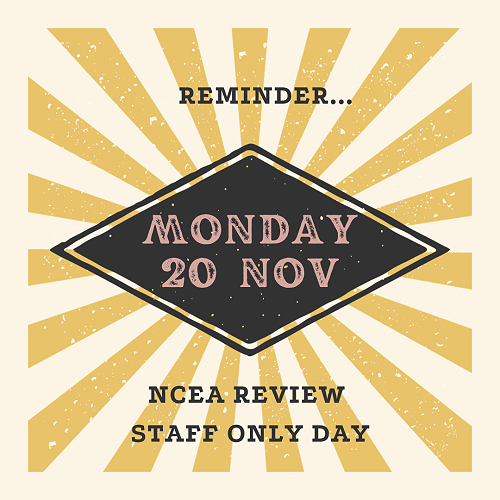 As previously advertised, there will be no classes on Monday 20 November while our staff engage in professional learning and development in preparation for NCEA changes and the curriculum refresh. Please note that exams are still on and are unaffected by the staff only day.
