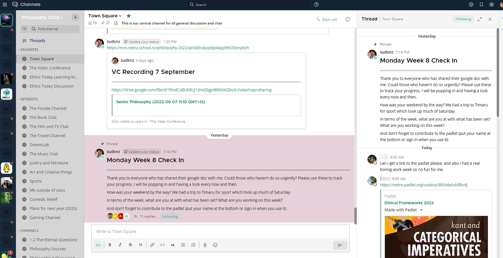 Our Philosophy community meets synchronously using video conferencing once a week. This is an important point of face to face type interaction. It goes someway (although not entirely) towards replicating the sense of immediacy we get when face to face. We see each other as live people, not as icons on a screen. For the rest of the week we learn asynchronously using an online hub as our homebase (although there may be some needs based video conferencing here and there). Our central point for all activity. My group uses a platform called Mattermost. It is highly interactive, discussion based and collaborative. We have a weekly check in to touch base, share our weekend, highlight what is on top for the week. All ākonga then work through the week’s learning (usually a part of a longer block of learning) which will include a mix of reading, research, online discussion, inquiring and knowledge building. They are able to spend some time working independently, but this is mixed in with a highly connected environment they all contribute to. All working as a learning community together. Well, that is the intent anyway.