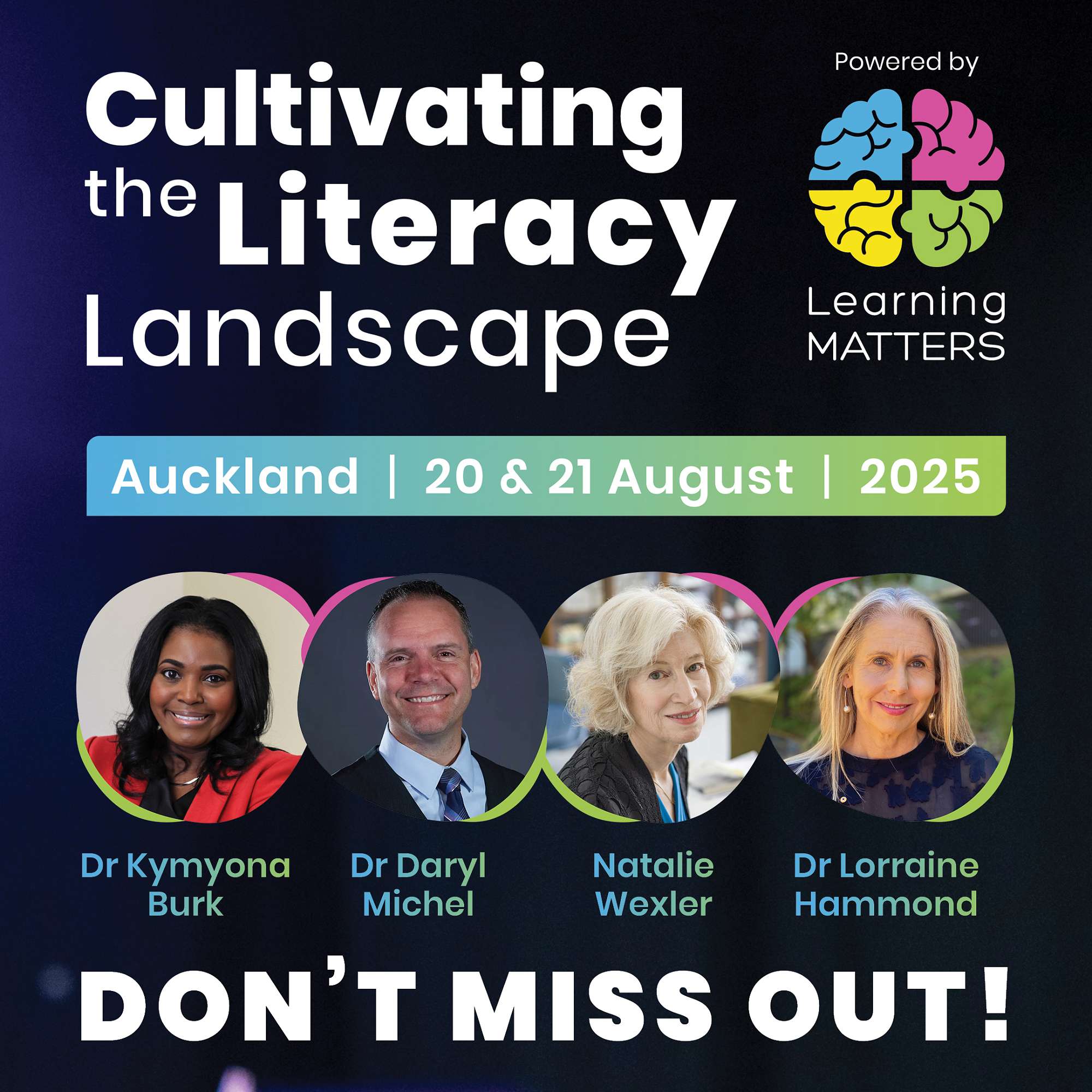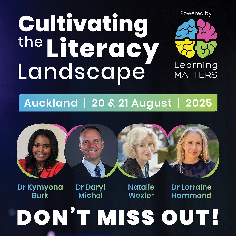 The Cultivating the Literacy Landscape Symposium 2025, hosted by Learning MATTERS, is a high impact event designed for educators, leaders, and literacy specialists ready to embed structured, evidence-informed practice that lasts. Held in Auckland on the 20th and 21st of August, this is not about more change, it’s about doing what works strategically and sustaining it. Headlined by four internationally respected literacy leaders, Dr Kymyona Burk, Dr Daryl Michel, Natalie Wexler and Dr Lorraine Hammond this event is not to be missed.