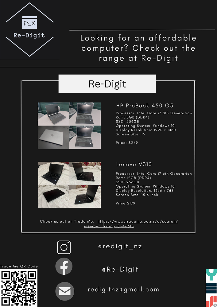 We are Re-Digit, a Year 13 business studies group from Onslow College. We are participating in YES (the Young Enterprise Scheme) and have a goal of making electronics and computers more affordable by selling refurbished laptops at cheap prices. This will lower the digital divide and overall reduce the enormous amount of E-waste being emitted each year. Additionally, as our electronics are going to be very affordable, we are going to focus on helping students – especially those who might be disadvantaged – purchase good electronics at fair prices, helping them to save significant amounts of money. This will help out students and their whānau. This should also greatly improve the ability of lower-income or disadvantaged students to complete schoolwork and, thus, should improve the overall performance of schools in the Wellington Region.