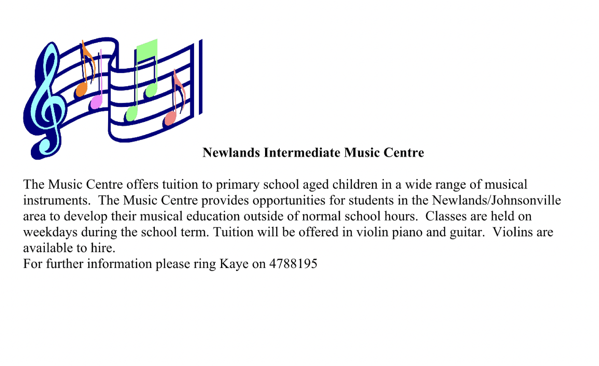 The Music Centre offers tuition to primary school aged children in a wide range of musical instruments. The Music Centre provides opportunities for students in the Newlands/Johnsonville