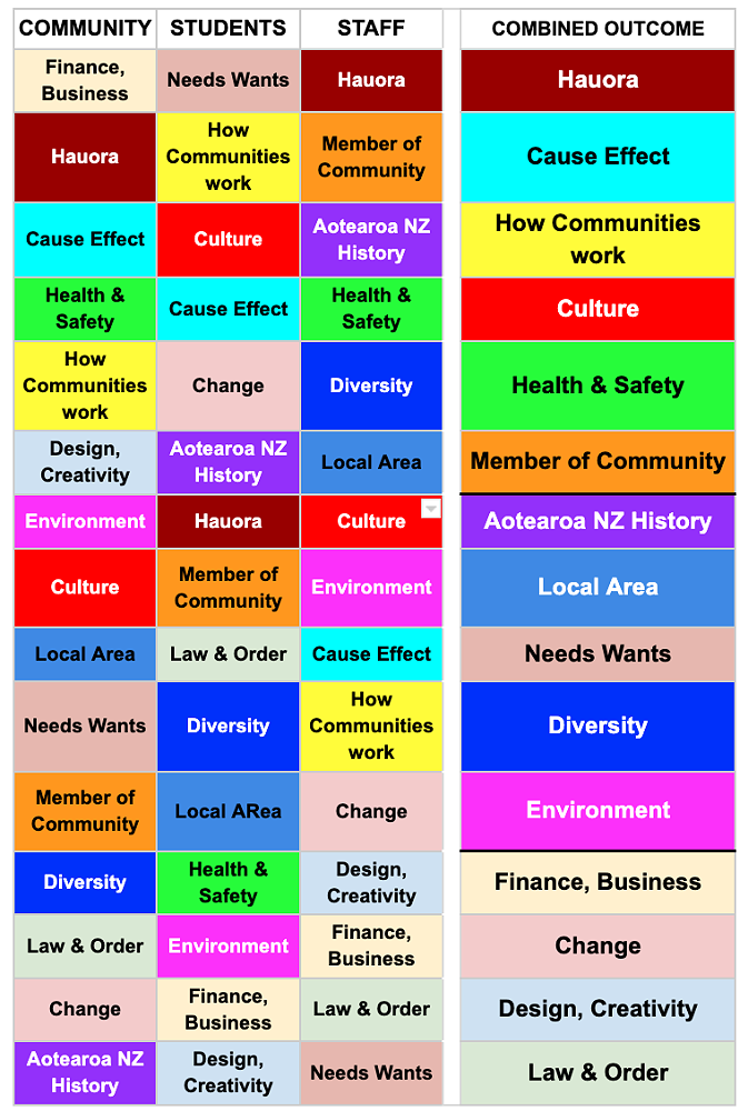 For the first part of this term we collated feedback from our community, students and staff to draft our localised curriculum. The feedback was analysed and prioritised for each of the 3 groups, and then combined (see chart below) to determine a school curriculum. The lead diagram to this article outlines the key concepts that were identified by our greater school community, which will form the framework for our learning programmes for the next few years. Behind this framework are detailed layers of planning to help staff unpack the learning programmes across the year groups.