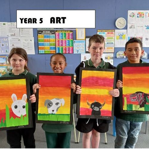 The children were learning to blend sunset colours. They were then told to choose an animal to draw in pastels, which they then cut out and applied to their sunset.